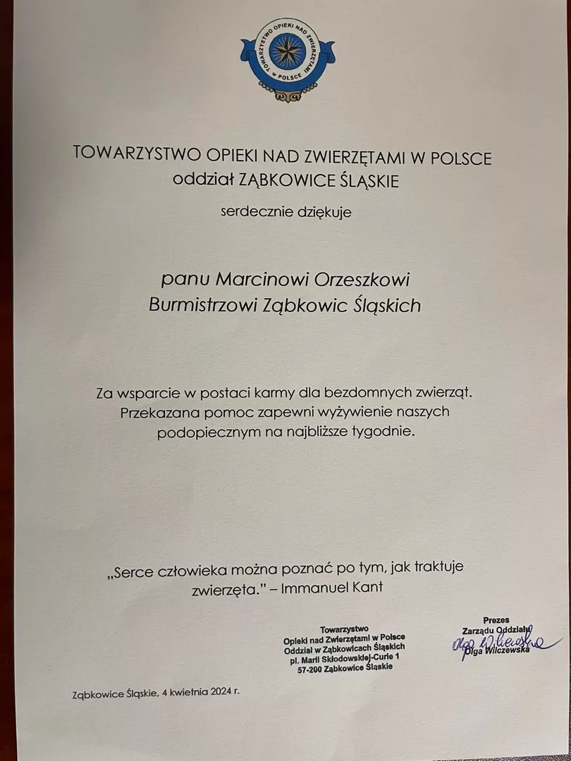 Z tej okazji nasi czworonożni przyjaciele otrzymali - jak co roku- prezent w postaci karmy. Wielkie podziękowania dla Towarzystwa Opieki nad Zwierzętami w Ząbkowicach Śl. za codzienną pracę na rzecz bezdomnych zwierząt.