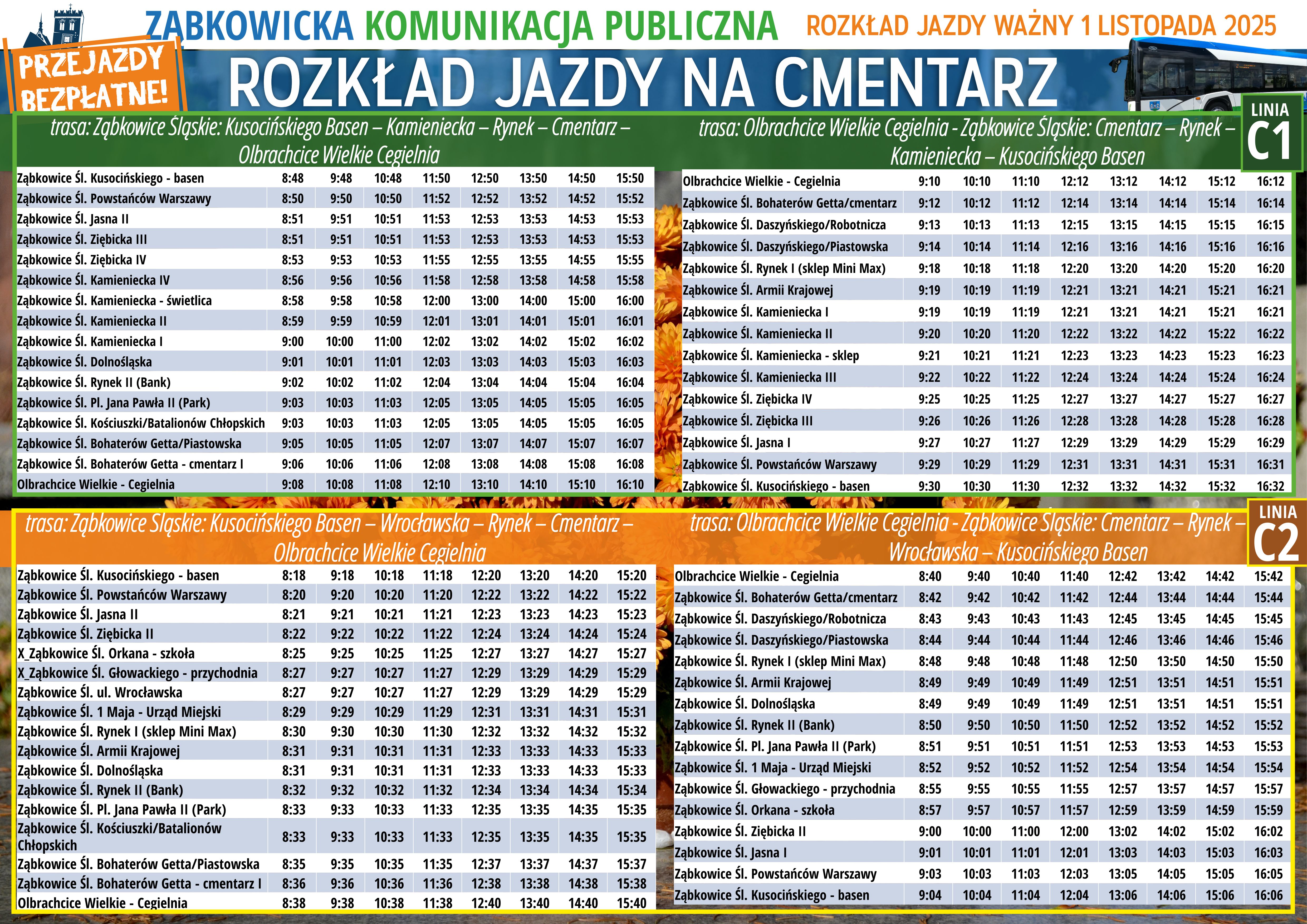 Bezpłatne przejazdy Ząbkowicką Komunikacją Publiczną na cmentarz w dniu 1 listopada 2025 r. - sprawdź rozkład jazdy