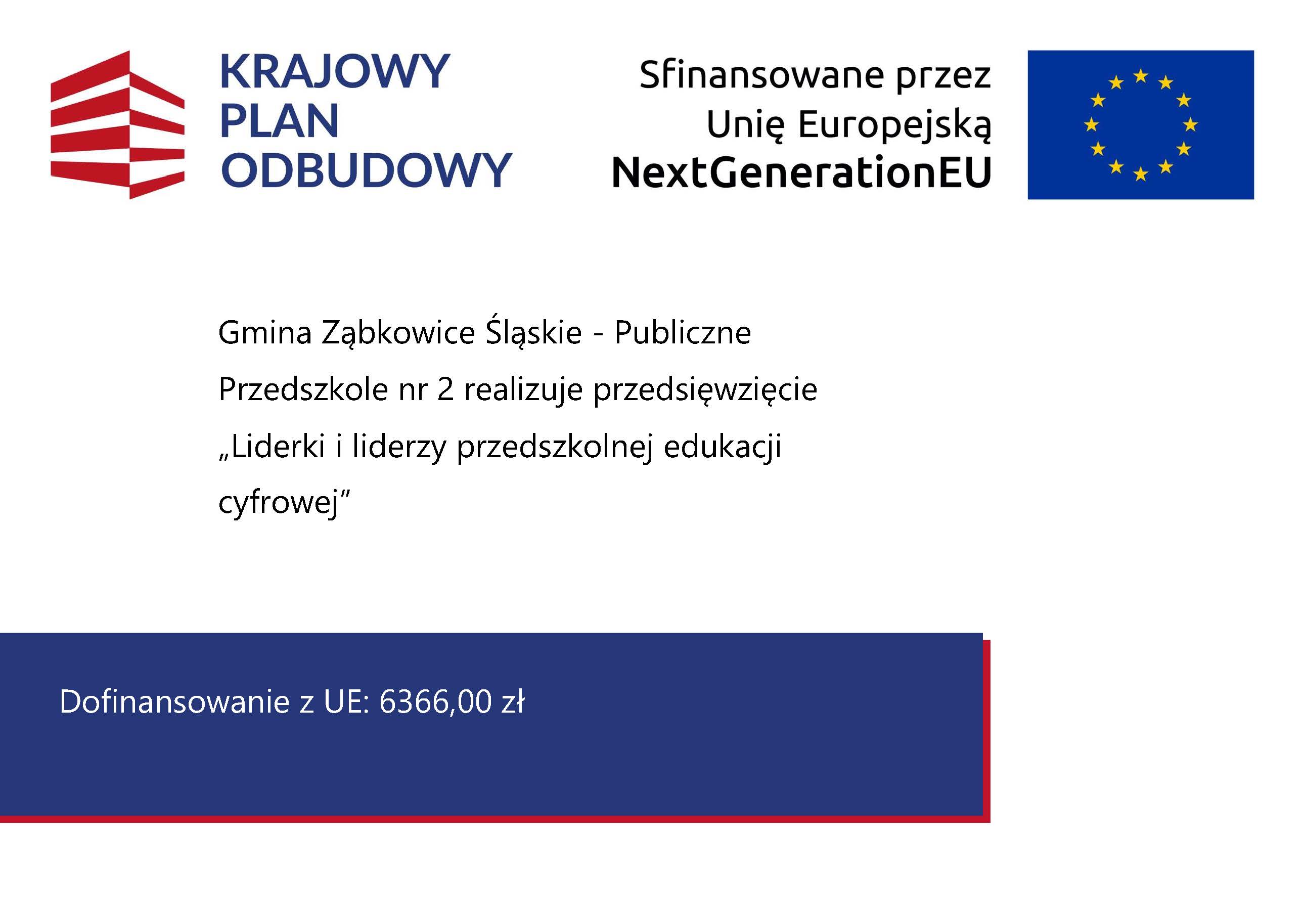 Gmina Ząbkowice Śląskie - Publiczne Przedszkole nr 2 otrzymała grant na zakup cyfrowych materiałów dydaktycznych w ramach przedsięwzięcia „Liderki i liderzy przedszkolnej edukacji cyfrowej” finansowanego ze środków UE - Instrumentu na Rzecz Odbudowy i Zwiększania Odporności, ramach Krajowego Planu Odbudowy - Reforma: C2.1: Zwiększenie skali zastosowań rozwiązań cyfrowych w sferze publicznej, gospodarce i społeczeństwie, Inwestycja C2.1.3: E-kompetencje.