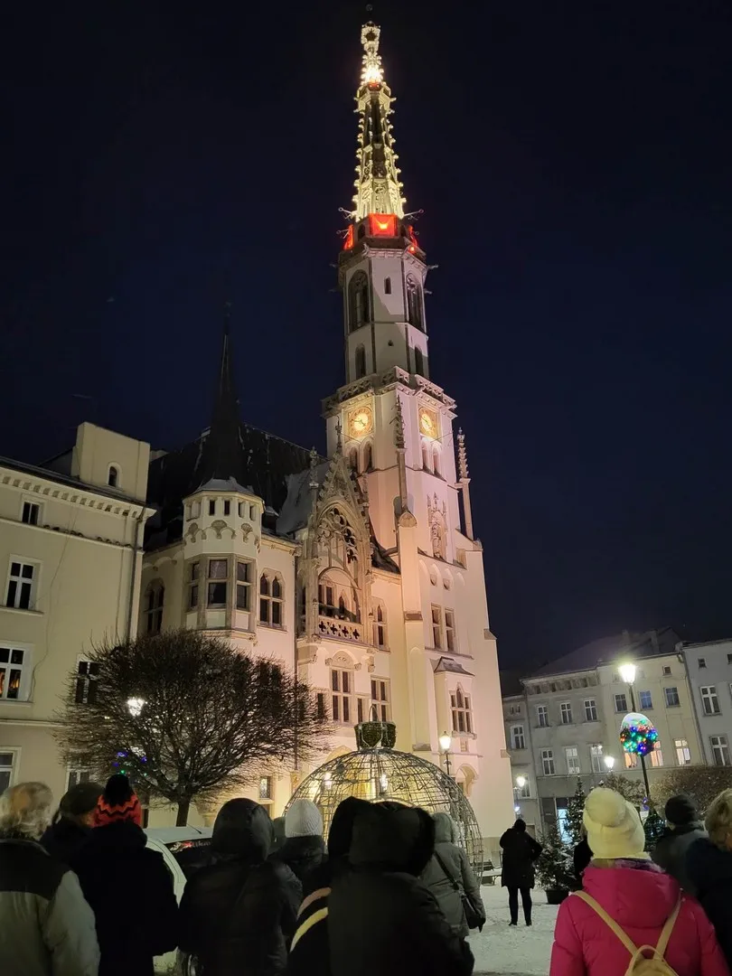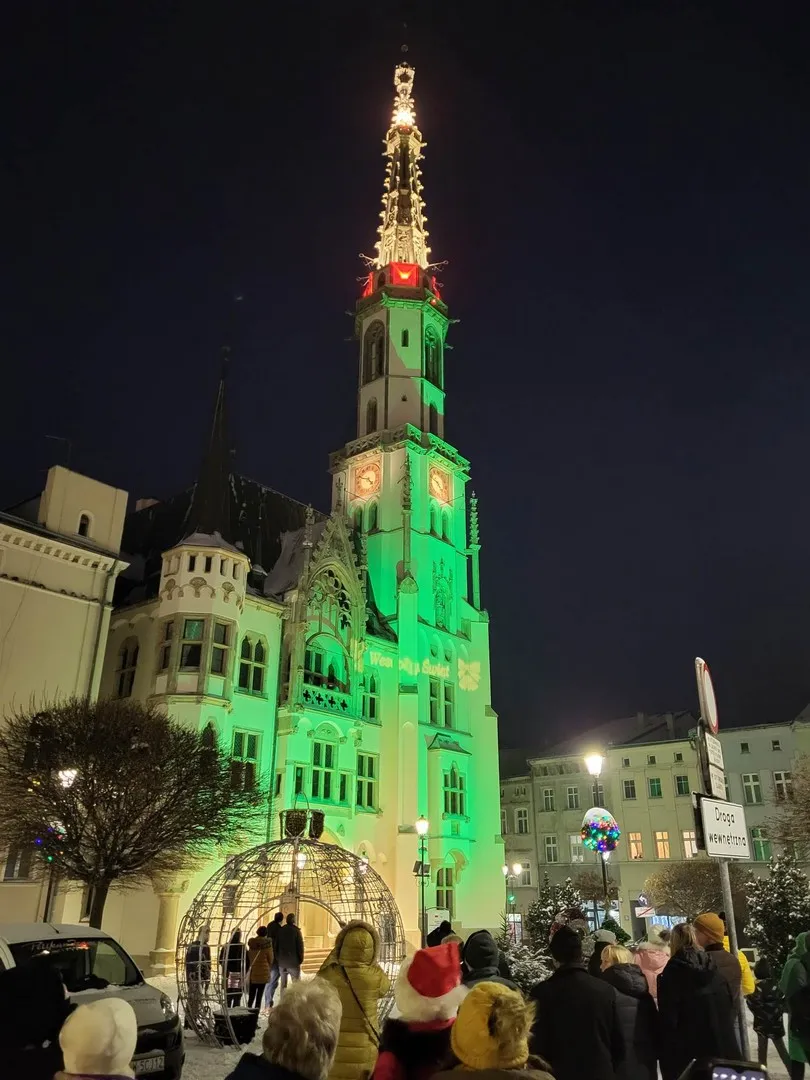Wiele osób czekało na końcówkę Jarmarku Bożonarodzeniowego, aby zobaczyć nową iluminację ratusza. O godzinie 16:30 wszyscy zebrani mogli podziwiać ratusz w kolorowym oświetleniu, które podkreślało nowy wygląd budynku po remoncie.