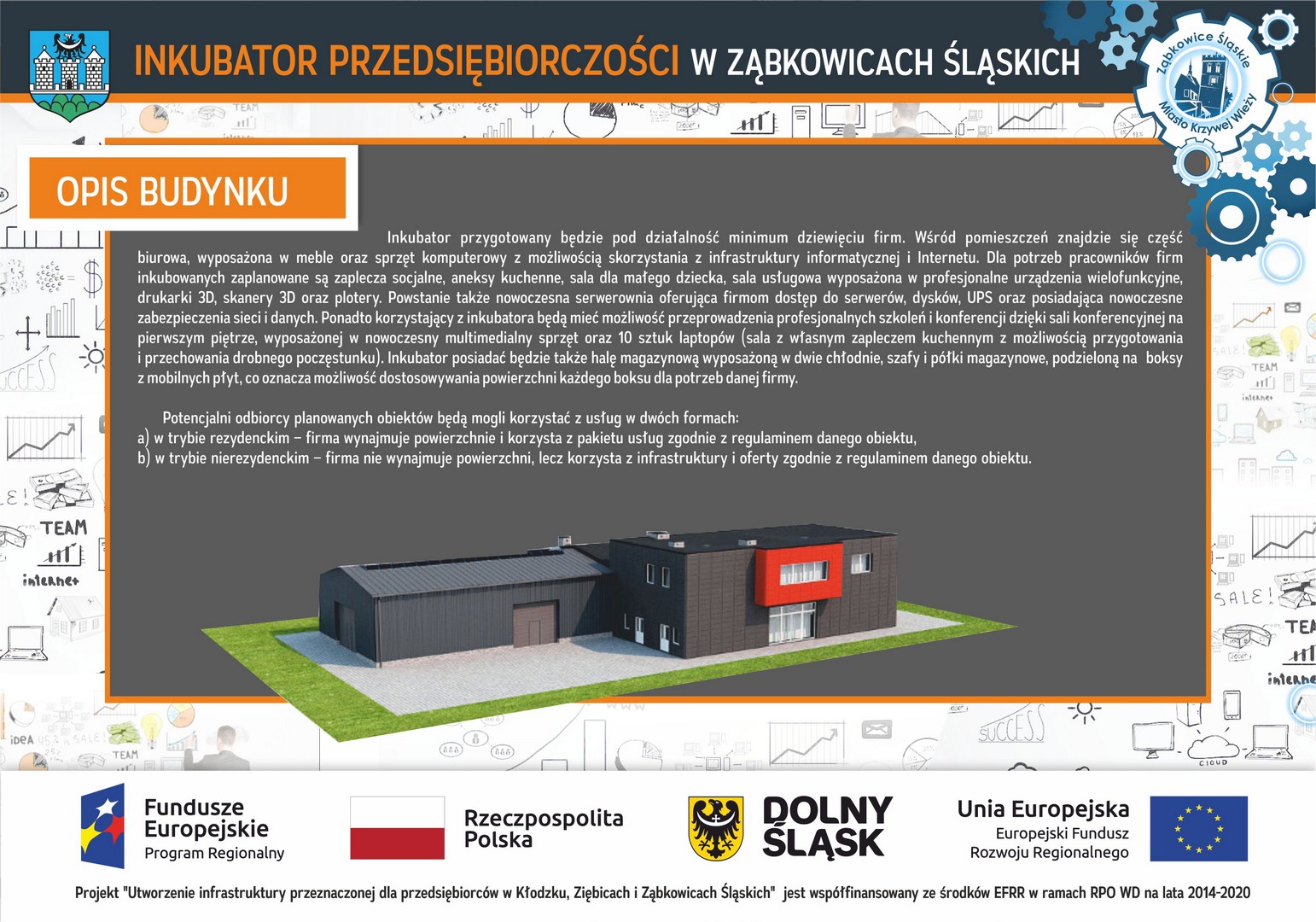 Będzie to realne wsparcie i pomoc dla przedsiębiorców z sektora mikro, małych i średnich przedsiębiorstw, rozpoczynających działalność gospodarczą na terenie Gminy Ząbkowice Śląskie. To niezwykle ważny element w dalszym rozwoju naszej gminy – efektem działalności inkubatora będą kolejne miejsca pracy i nowe firmy. Planowane zakończenie budowy przypada na czerwiec 2023 r.