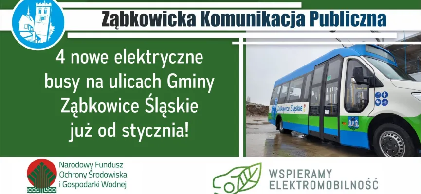 Autobusy wyruszą na trasy od 2 stycznia na dwóch liniach A i B. Zadanie realizowane jest w ramach projektu Ograniczenie niskiej emisji w Ząbkowicach Śląskich poprzez zakup zeroemisyjnego elektrycznego taboru autobusowego do obsługi Ząbkowickiej Komunikacji Publicznej w ramach programu „Zielony Transport Publiczny. Dofinansowanie przyznane jest przez Narodowy Fundusz Ochrony Środowiska i Gospodarki Wodnej.
