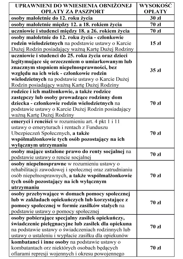 za wydanie paszportu należy przedstawić do wglądu dokument potwierdzający to uprawnienie, np.: ważną legitymację studencką, emeryta-rencisty, orzeczenie o niepełnosprawności, ważną Kartę Dużej Rodziny,