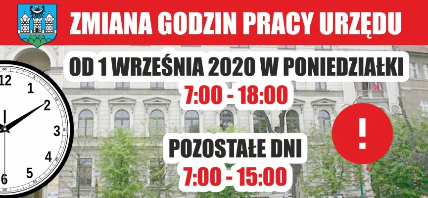 Od 1 września 2020 r. Urząd Miejski czynny w poniedziałki do godz. 18:00
