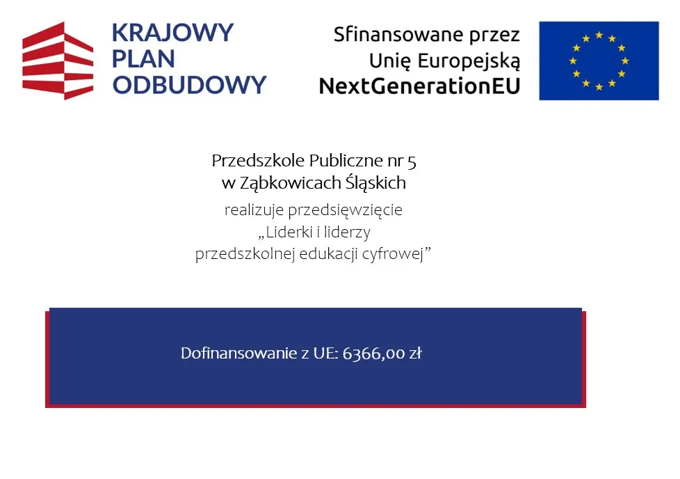 W ramach projektu "Liderzy i liderki przedszkolnej edukacji cyfrowej" Przedszkole Publiczne nr 5 otrzymało grant na zakup cyfrowych materiałów dydaktycznych do przedszkola w kwocie 6 366 zł.