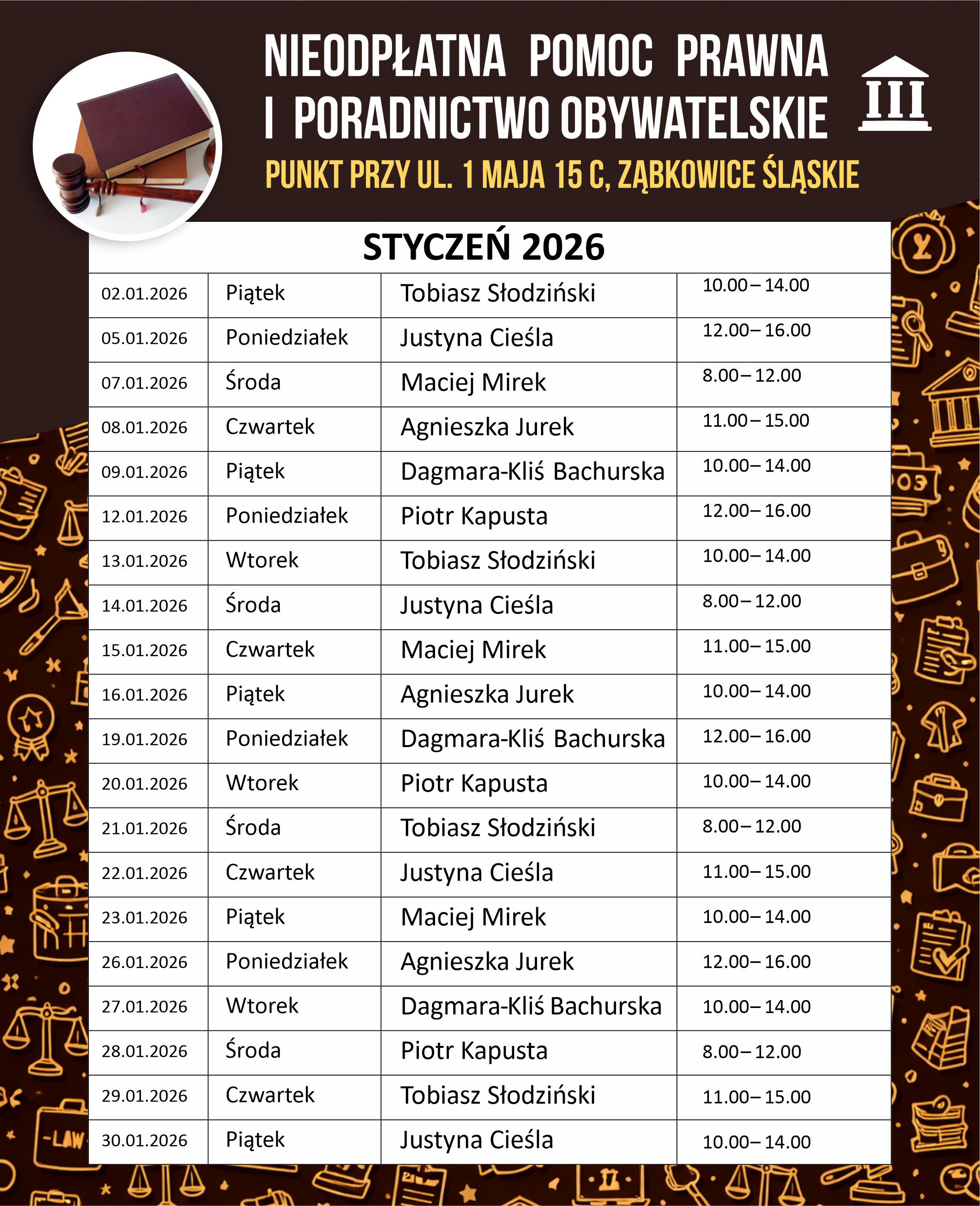 Przedstawiamy harmonogram świadczenia nieodpłatnej pomocy prawnej oraz nieodpłatnego poradnictwa obywatelskiego przez radców prawnych oraz adwokatów w 2026 roku, w Punkcie nieodpłatnej pomocy prawnej zlokalizowanym w Ząbkowicach Śląskich przy ul. 1 Maja 15c:
