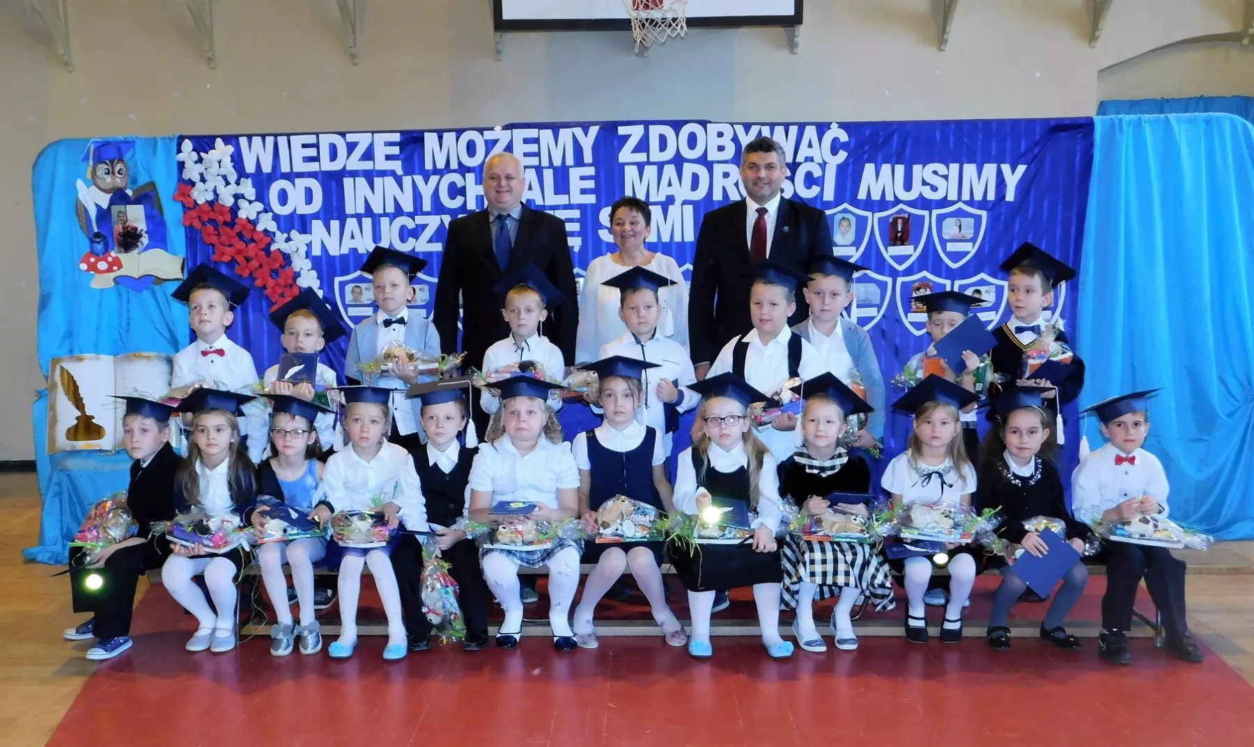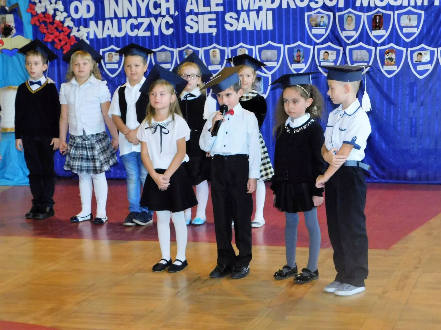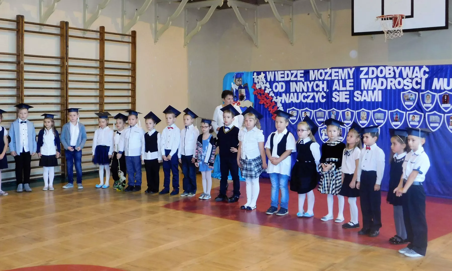 Uroczystość rozpoczęto o godzinie 9:00 od przywitania przybyłych gości: pana burmistrza Marcina Orzeszka, rodziców, pana dyrektora Andrzeja Popławskiego oraz pracowników i uczniów szkoły. Następnie pierwszoklasiści pięknie przedstawili swój program artystyczny, przygotowany specjalnie na tę okazję.