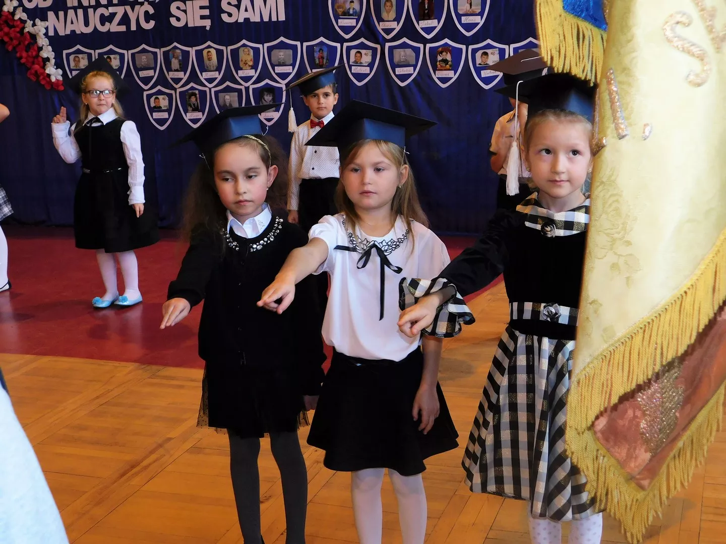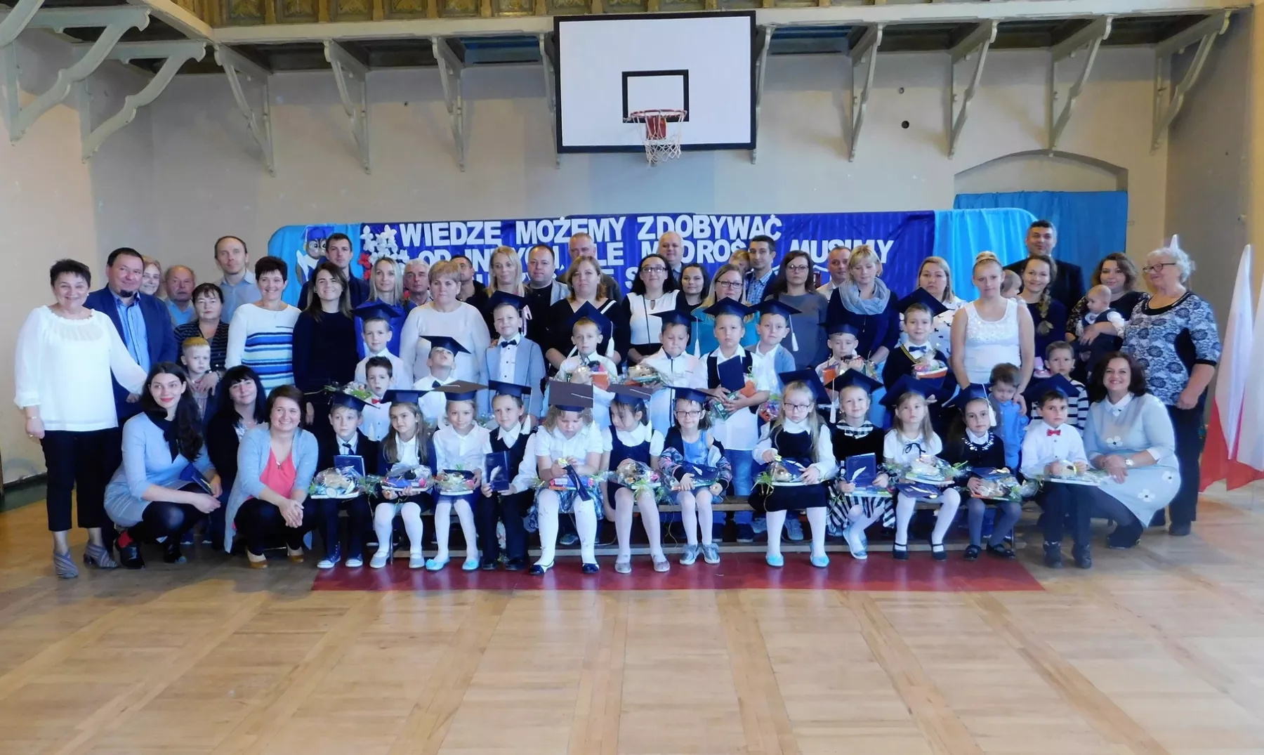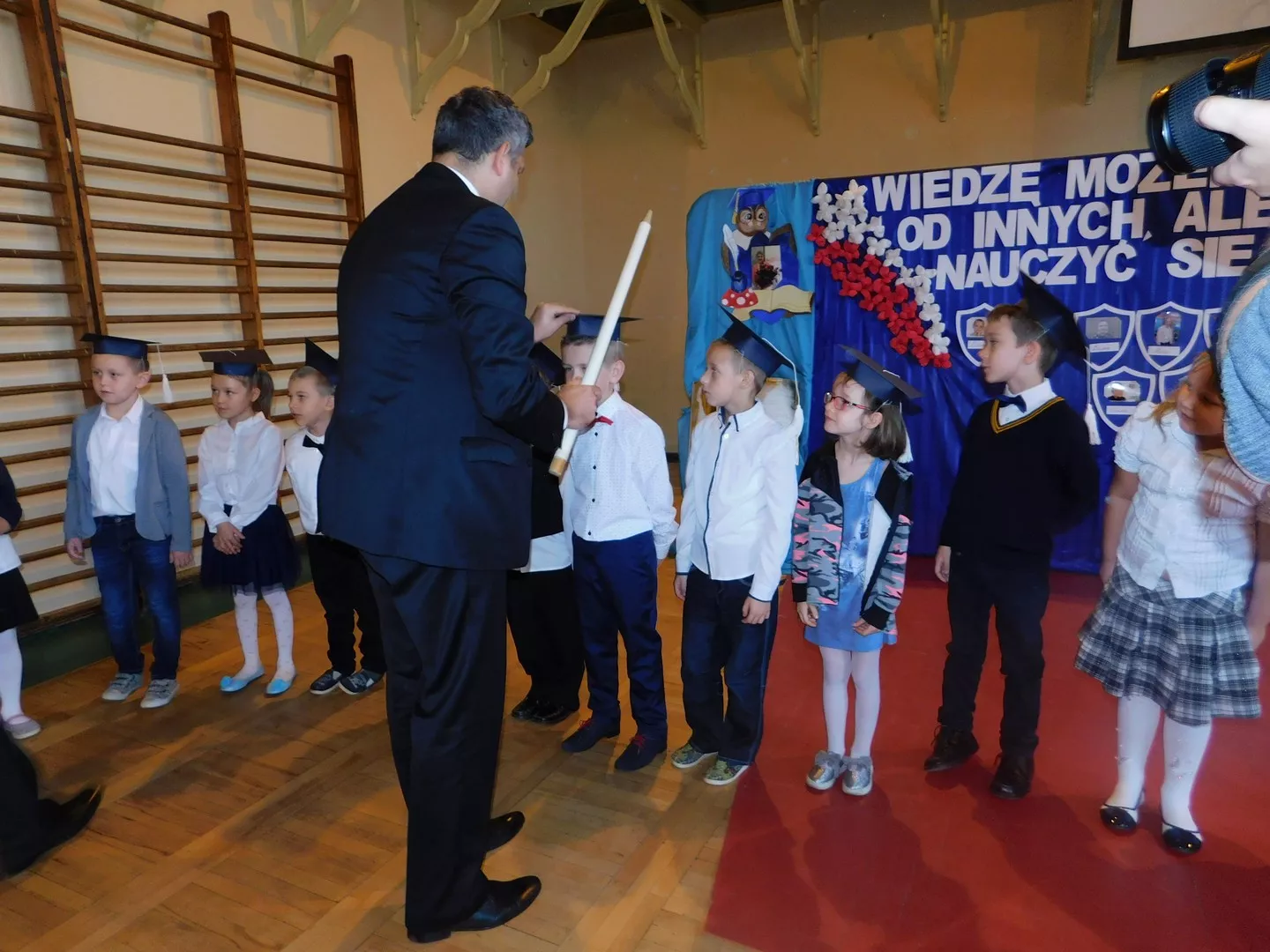 Uroczystość rozpoczęto o godzinie 9:00 od przywitania przybyłych gości: pana burmistrza Marcina Orzeszka, rodziców, pana dyrektora Andrzeja Popławskiego oraz pracowników i uczniów szkoły. Następnie pierwszoklasiści pięknie przedstawili swój program artystyczny, przygotowany specjalnie na tę okazję.