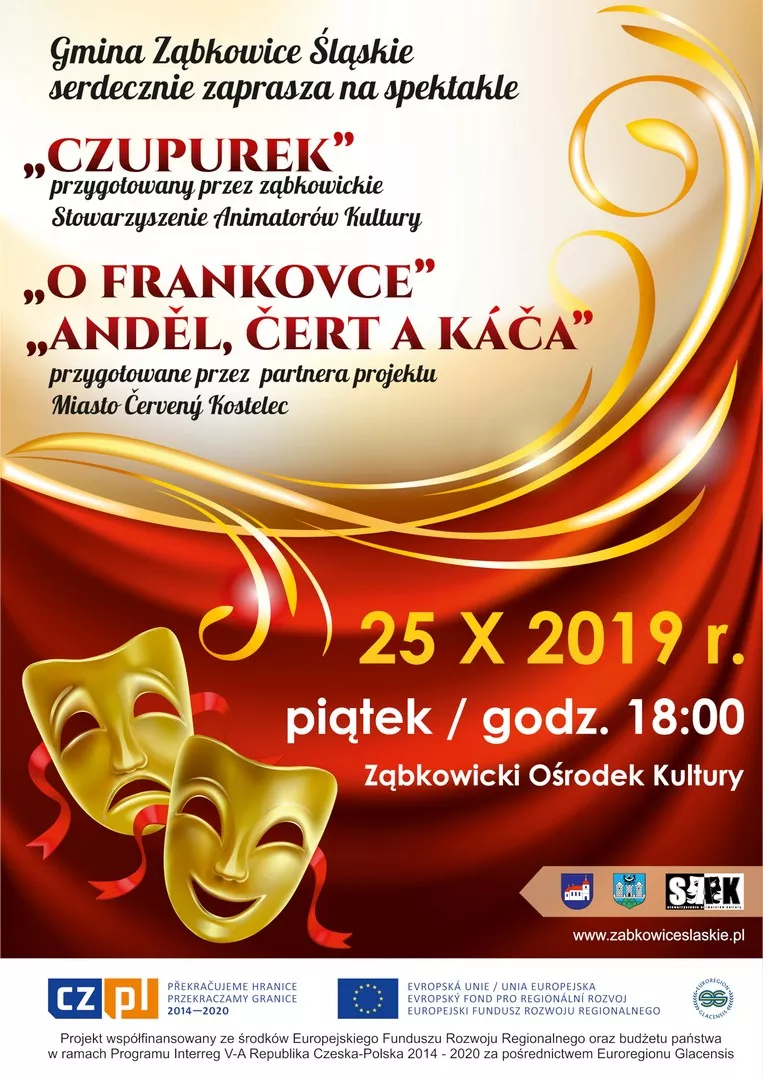 W dniu 25 października 2019 r. w Ząbkowickim Ośrodku Kultury odbyły się 3 spektakle teatralne. Stowarzyszenie Animatorów Kultury wystawili w nowej obsadzie i nowych dekoracjach „Czupurka”, a nasz partner- miasto Cerveny Kostelec odwiedził nas ze świetnymi spektaklami „O Frankovce" i "Andel Cert a Kaca". Spektakle były bardzo interesujące, widownia była pełna. Dzięki sztukom pogłębiliśmy wiedzę dot. kultury, humoru i zabawy naszego czeskiego partnera jednocześnie mile spędzając czas.