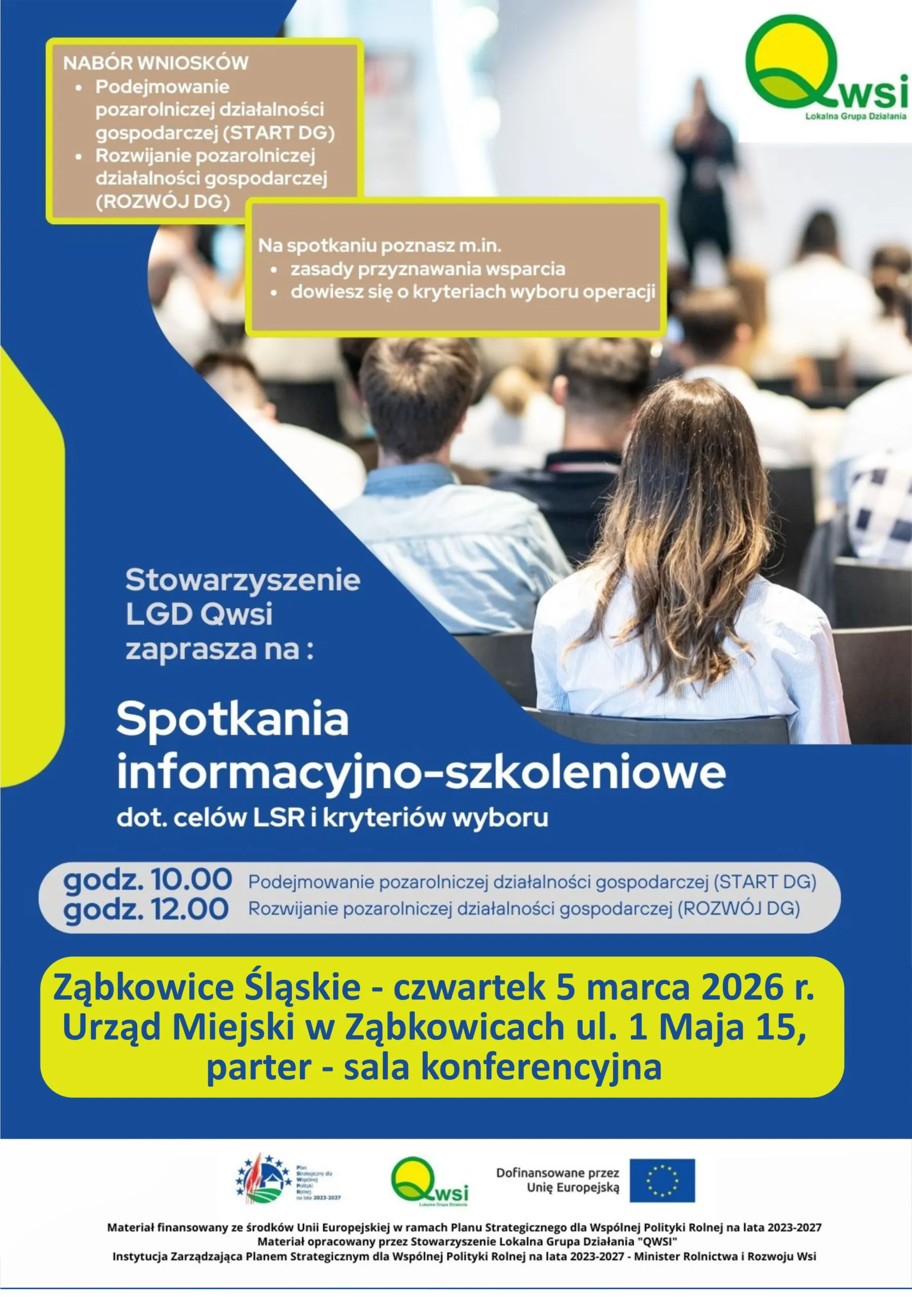 Zapraszamy wszystkie osoby zainteresowane pozyskaniem dofinansowania oraz rozwojem przedsiębiorczości z obszaru LGD „Qwsi”.