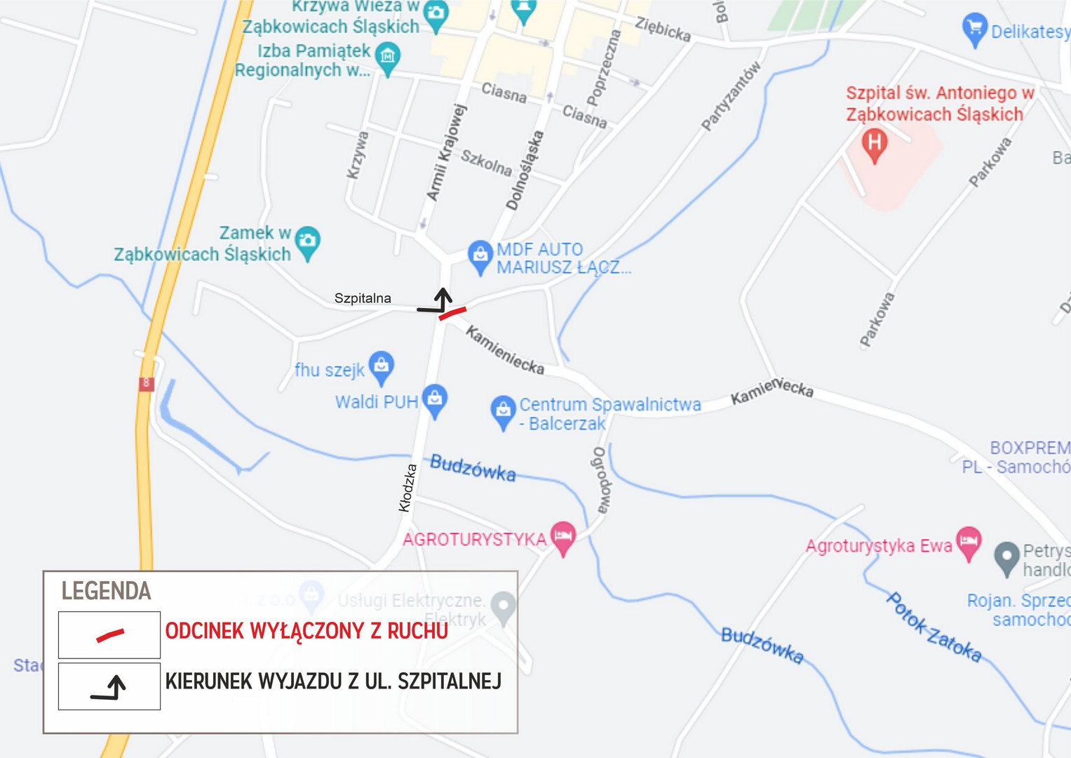 Wyłączona z ruchu zostaje czasowo ul. Partyzantów w Ząbkowicach Śląskich od skrzyżowania z ul. Kłodzką do zjazdu do posesji porządkowej numer 1. Skomunikowanie posesji i firm mających swoją siedzibę przy ul. Partyzantów 1 w Ząbkowicach Śląskich odbywało się będzie od strony ul. Kamienieckiej (łącznik do ul. Partyzantów).