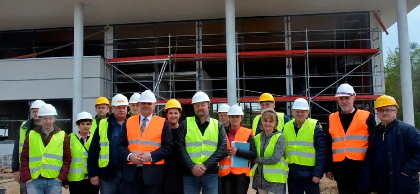 Grupa radnych Rady Miejskiej Ząbkowic Śląskich wyraziła chęć obejrzenia z bliska i sprawdzenia postępów prac przy budowie krytego basenu – największej inwestycji w najnowszej historii gminy. Burmistrz Marcin Orzeszek wraz z radnymi odwiedził we wtorek 7 maja teren budowy. Radni dokładnie obejrzeli postępy prac i ocenili je pozytywnie. Budowa postępuje bowiem zgodnie z planem, w najbliższym czasie montowane będą już elementy fasady szklanej.