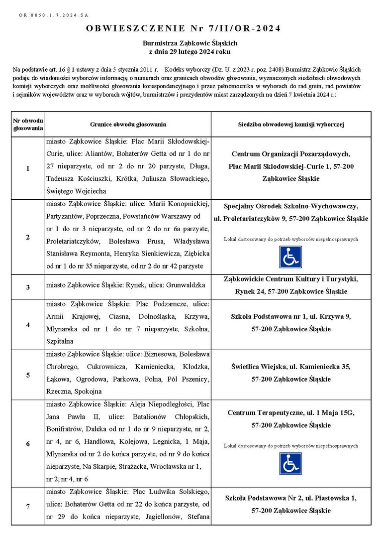 Zachęcamy do zapoznania się z Obwieszczeniem Nr 7/II/OR-2024 Burmistrza Ząbkowic Śląskich z dnia 29 lutego 2024 r. i zwrócenie uwagi z wyprzedzeniem na wprowadzone zmiany, aby uniknąć w dniu wyborów szukania miejsca, w którym możecie Państwo zagłosować.