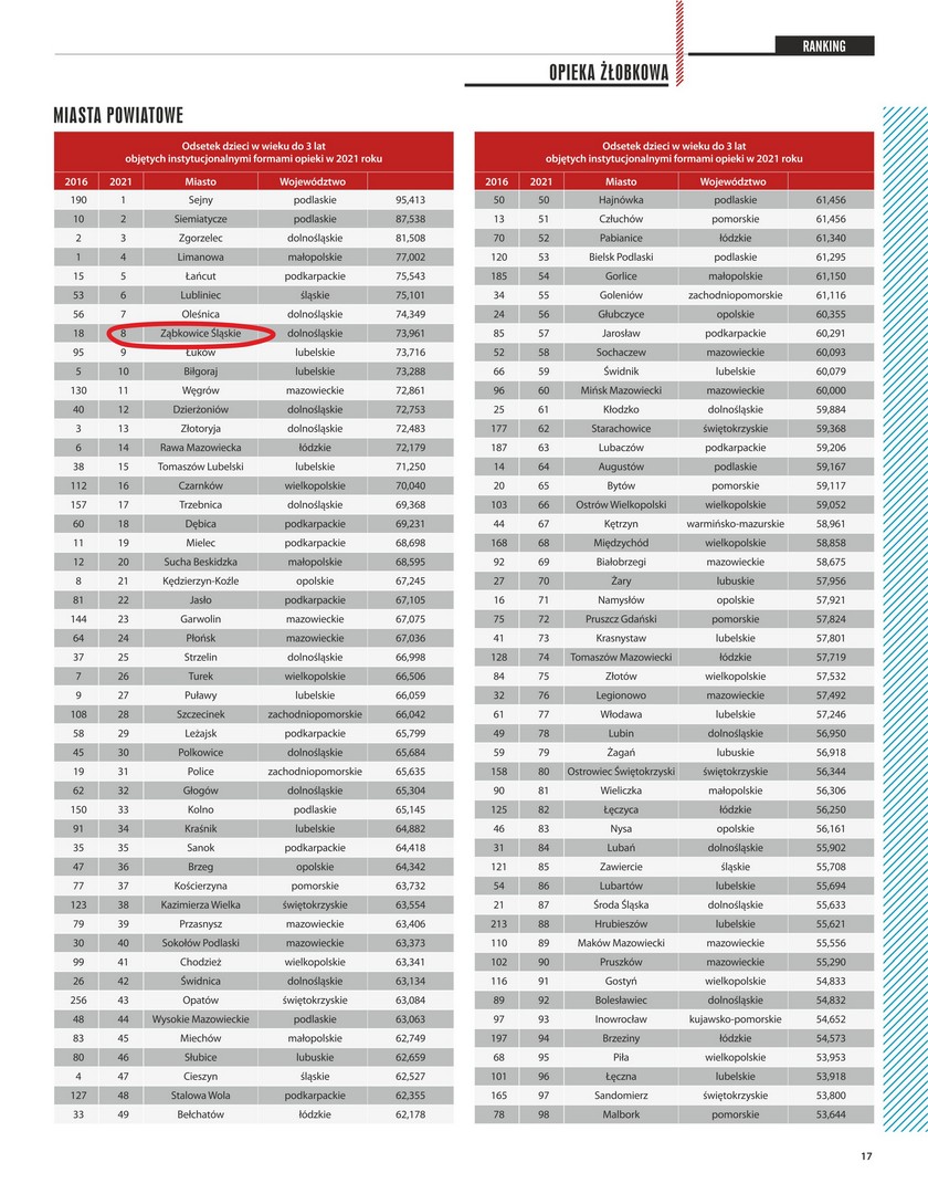 Ponadto Ząbkowice Śląskie zajęły 3 miejsce w województwie dolnośląskim, 1 w subregionie wałbrzyskim oraz 1 w powiecie ząbkowickim!