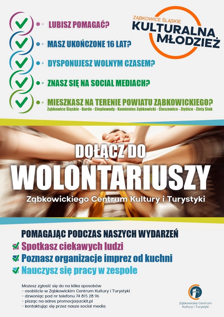 Ponadto młodzież zachęcamy do zgłoszeń na wolontariat przy Ząbkowickim Centrum Kultury i Turystyki.