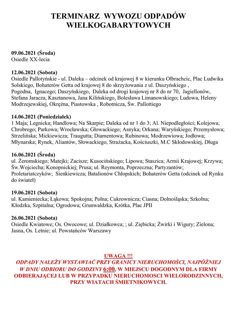 Zbiórka odpadów wielkogabarytowych – harmonogram na 2021r.