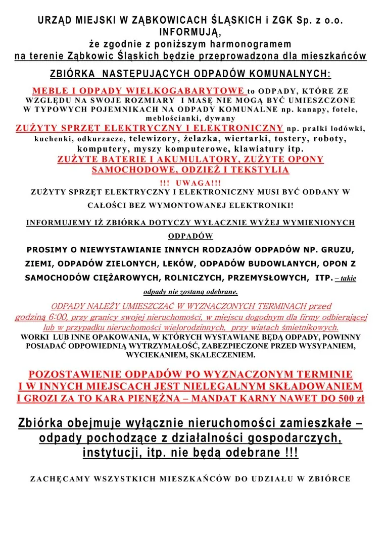 Odpady wielkogabarytowe muszą być ustawione przed posesją – w sąsiedztwie miejsc, w których gromadzone są odpady komunalne. Zbiórka prowadzona będzie według harmonogramu, który dostępny jest w załączniku. Poza terminami zbiórek odpady wielkogabarytowe można przekazać do Punktu Selektywnego Zbierania Odpadów Komunalnych (PSZOK) znajdującego się przy ul. Legnickiej nr 16 w Ząbkowicach Śl. (dawna zajezdnia PKS) w godzinach: pn-pt 9:00 – 17:00, sb 10:00 – 13:00.