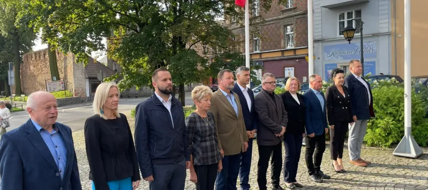 Pod pomnikiem Poległym za Ojczyznę burmistrz Marcin Orzeszek wraz z Przewodniczącym Rady Miejskiej Andrzejem Dominikiem i delegacją samorządu Gminy Ząbkowice Śląskie złożyli kwiaty, aby upamiętnić naszych rodaków, którzy walczyli na wszystkich frontach II Wojny Światowej.