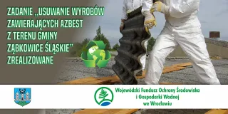 Gmina Ząbkowice Śląskie w roku 2018 zakończyła zadanie pn: „Usuwanie wyrobów zawierających azbest z terenu Gminy Ząbkowice Śląskie w roku 2018”, które zrealizowano ze środków finansowych przeznaczonych na realizację gminnych programów usuwania azbestu i wyrobów zawierających azbest przy wsparciu finansowym Wojewódzkiego Funduszu Ochrony Środowiska i Gospodarki Wodnej we Wrocławiu, zgodnie z umową dotacji nr 401/D/OZ/WB/2018.
