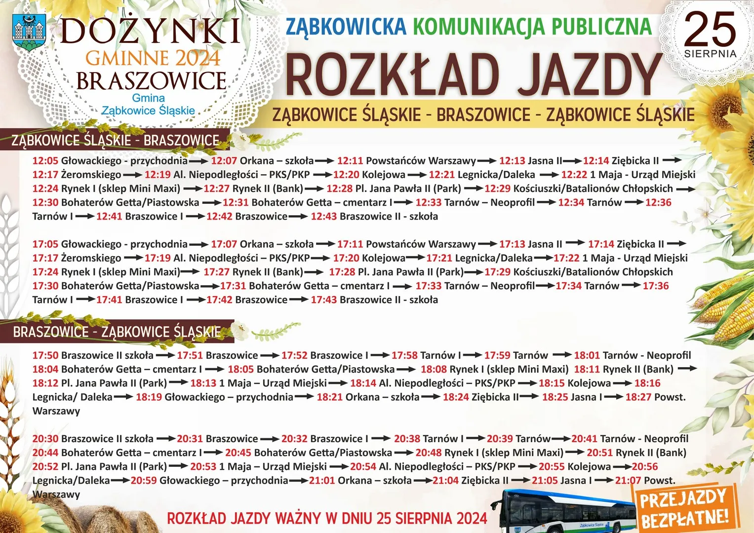 Bezpłatne przejazdy Ząbkowicką Komunikacją Publiczną na DOŻYNKI w dniu 25 sierpnia 2024 r. - sprawdź rozkład jazdy