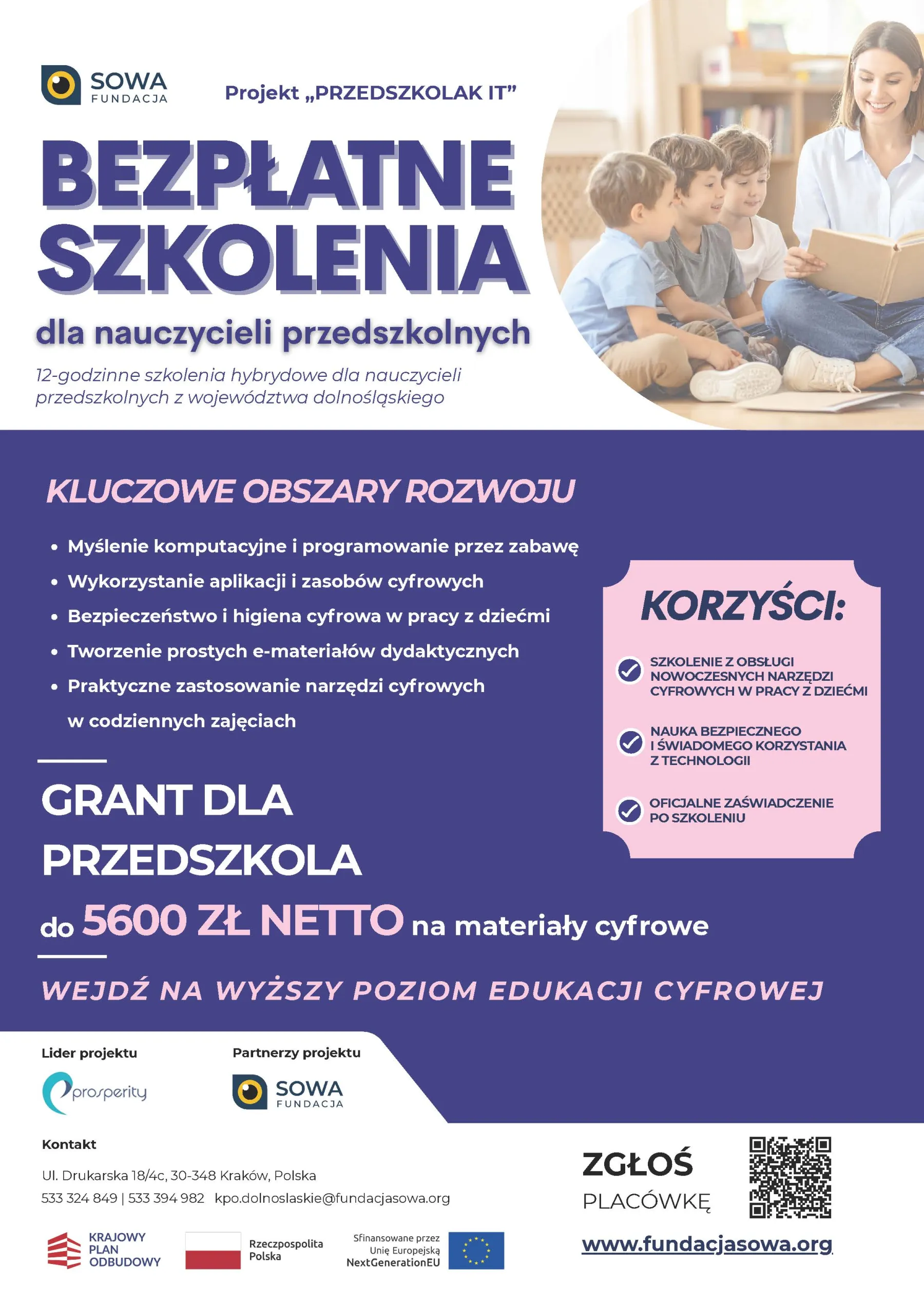 Fundacja SOWA zaprasza nauczycieli wychowania przedszkolnego z województwa dolnośląskiego do udziału w bezpłatnym projekcie „Przedszkolak IT”, realizowanym w ramach Krajowego Planu Odbudowy i Zwiększania Odporności (Inwestycja C2.1.3 „E-kompetencje”).