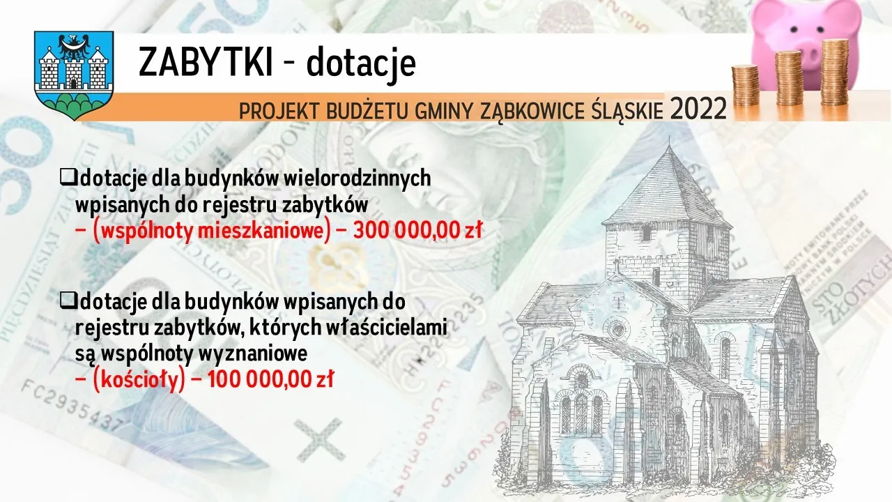 - dotacje dla wspólnot mieszkaniowych i wspólnot wyznaniowych na remonty budynków.