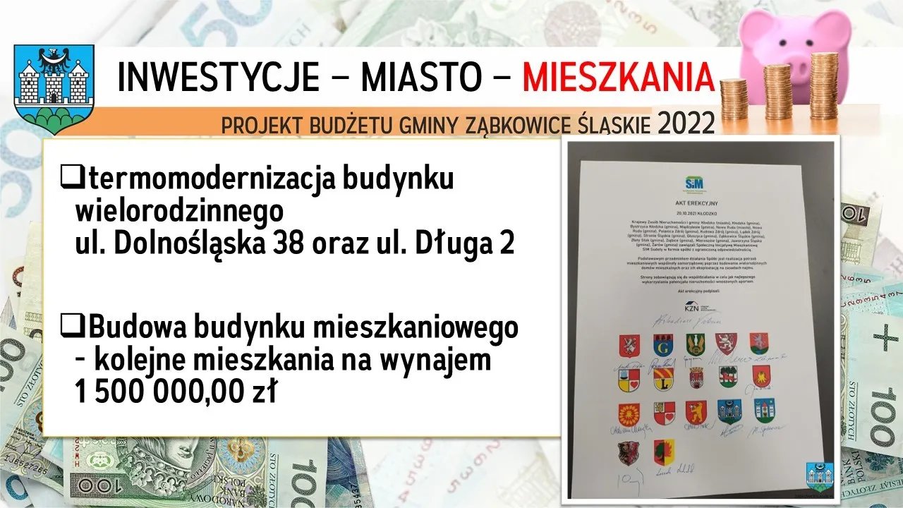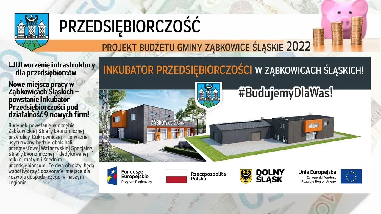 - utworzenie infrastruktury dla przedsiębiorców - nowe miejsca pracy w Ząbkowicach Śląskich – powstanie Inkubator Przedsiębiorczości pod działalność 9 nowych firm!;