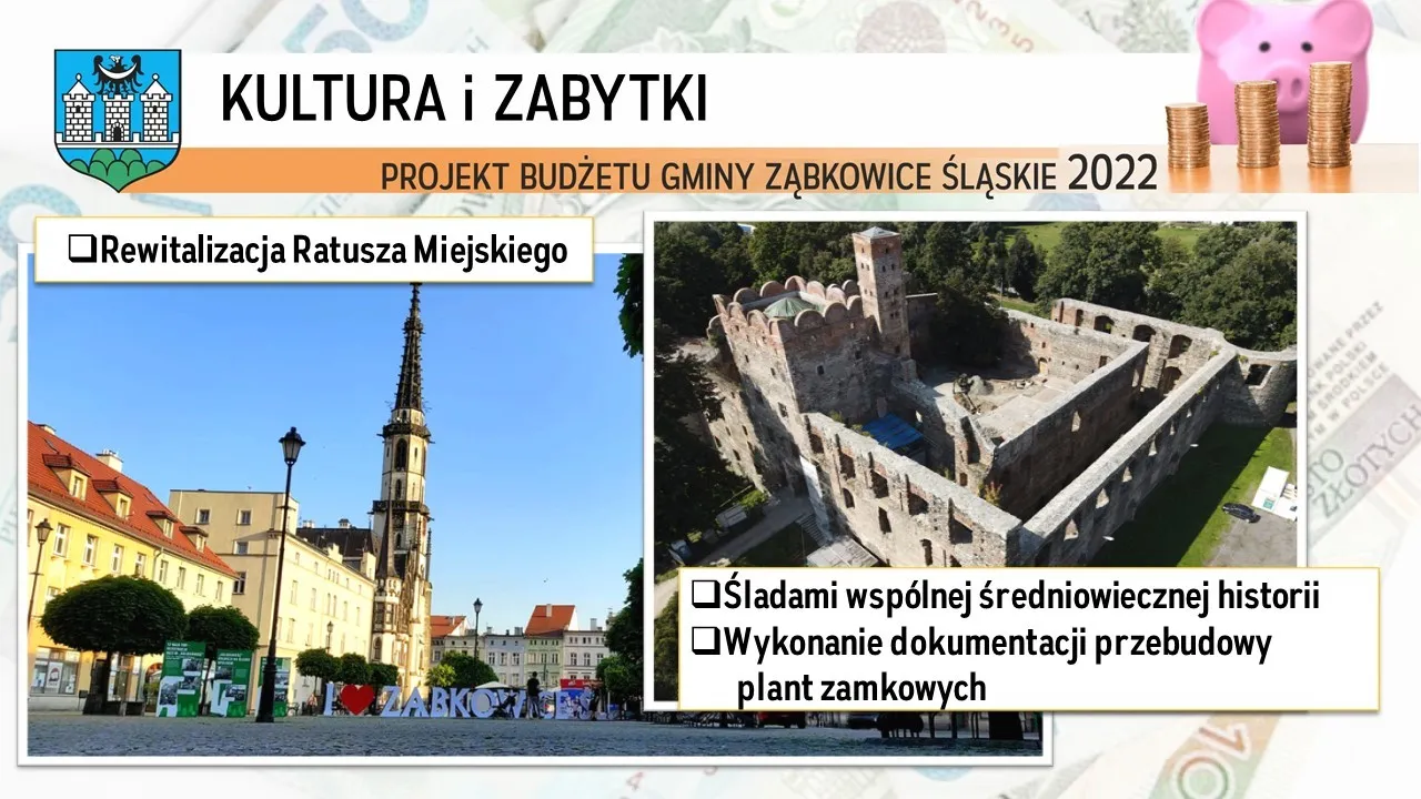 - inwestycje w kulturę i zabytki (rewitalizacja Ratusza, Zamku, dokumentacja na przebudowę plant zamkowych);