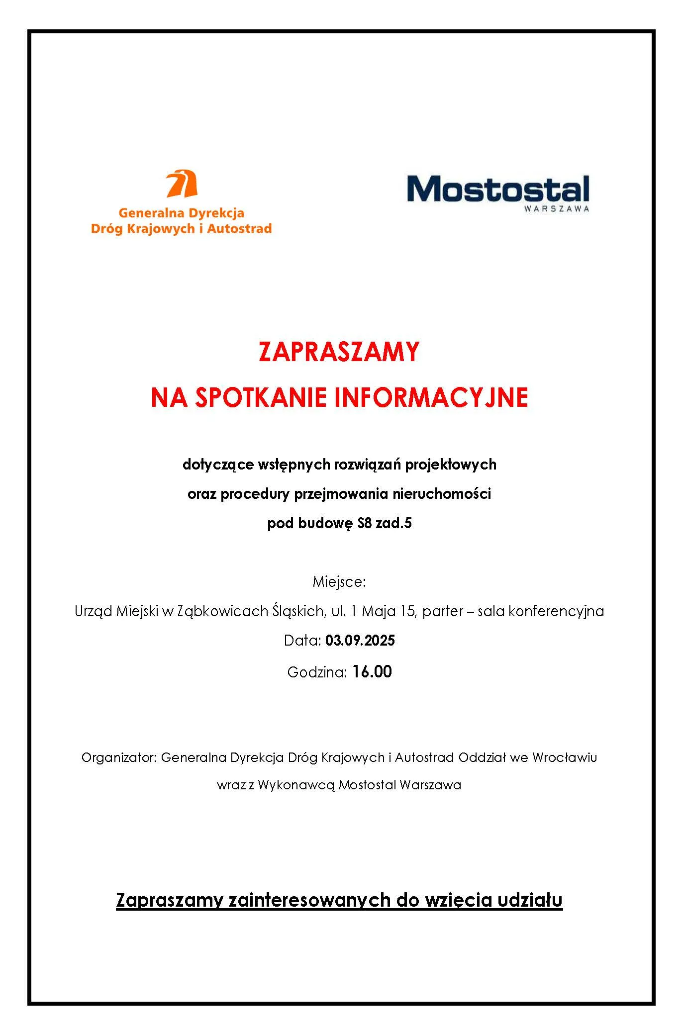 Generalna Dyrekcja Dróg Krajowych i Autostrad Oddział we Wrocławiu wraz z Wykonawcą Mostostal Warszwa zapraszają na spotkanie informacyjne dotyczące wstępnych rozwiązań projektowych oraz procedury przejmowania nieruchomości pod budowę S8.