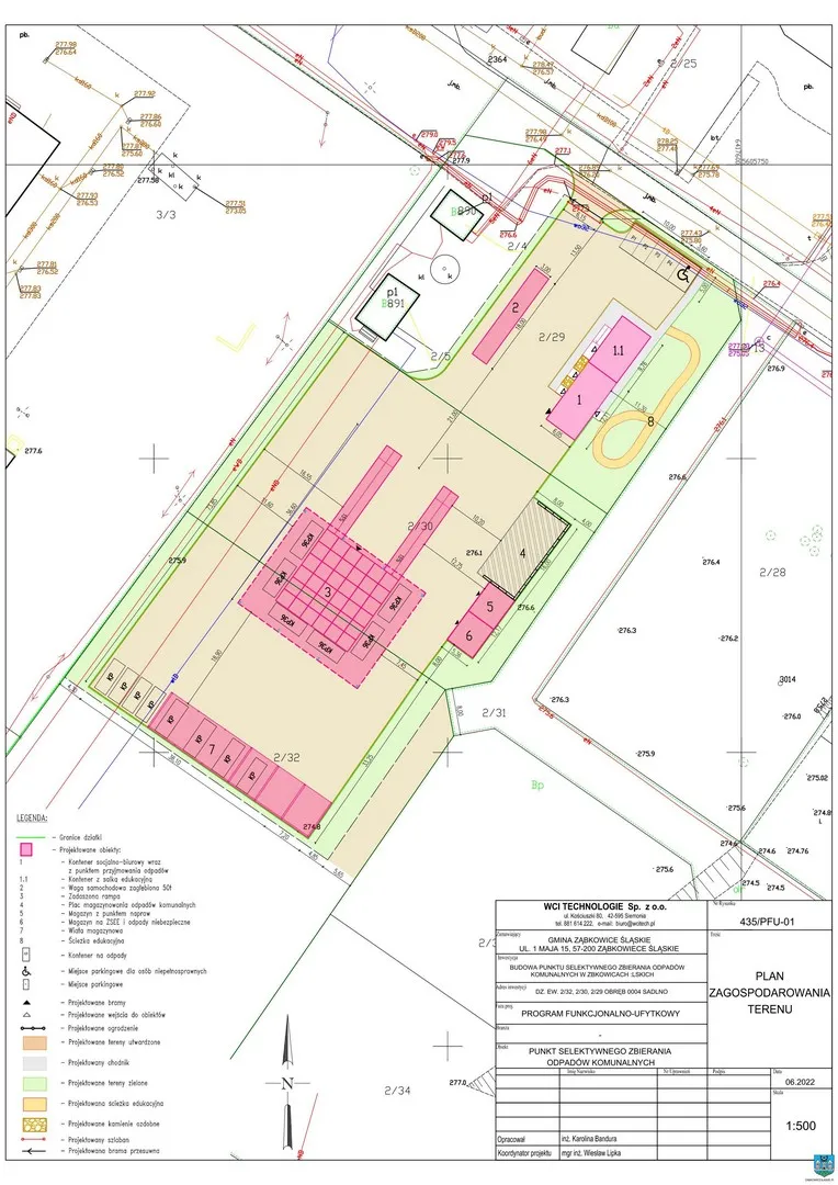 W ramach zadania przewiduje się opracowanie kompletnej dokumentacji projektowej wraz z uzyskaniem pozwolenia na budowę/zgłoszenia na prowadzenie robót na podstawie programu funkcjonalno - użytkowego, koncepcji, wykonanie robót budowlanych w zakresie budowy stacjonarnego punktu selektywnego zbierania odpadów komunalnych w Ząbkowicach Śląskich. Uzyskanie pozwolenia na usunięcie drzew, uzyskanie ekspertyzy dendrologicznej, opinii ornitologicznej, a w razie takiej konieczności pełnienie nadzoru ornitologicznego podczas wycinki drzew. Wykonanie wycinki drzew wraz z karczowaniem pni zgodnie z wcześniej uzyskaną decyzją pozwoleniem na usunięcie drzew, przy czym Wykonawca własnym staraniem i kosztem dokona oględzin drzew przez osobę uprawnioną pod katem stwierdzenia czy drzewo nie zostało zasiedlone. Dokumentację z oględzin przekaże Zamawiającemu przed dokonaniem wycinki drzew. Do zadań Wykonawcy należało będzie przygotowanie grubizny wyciętych drzew zgodnie z klasyfikacją jakościowo-wymiarową oraz pocięcie grubizny z wyciętych drzew na odcinki z transportem w miejsce wskazane przez Zamawiającego do 5 kilometrów i ułożeniem drzewa w stosy. Wykonawca zobowiązany będzie do utylizacji odpadów, gałęzi i krzewów wyciętych drzew. Po karczowaniu drzew Wykonawca wyprofiluje nawierzchnie działek w których prowadzona była wycinka. Wykonawca zobowiązany będzie do zakupu sadzonek i wykonania nasadzeń zastępczych zgodnie z decyzją - lokalizacją wskazaną przez Zamawiającego.Wyposażenie PSZOK w Ząbkowicach Śląskich stanowić między innymi będą: kontener socjalno-biurowy z punktem przyjmowania odpadów (punkt przyjmowania odpadów, część biurowa, część socjalna, pomieszczenia sanitarne), kontener z salką edukacyjną, rampa najazdowa zadaszona (6 sztuk kontenerów KP36), magazyn z punktem napraw, magazyn na Zużyty Sprzęt Elektryczny i Elektroniczny i odpady niebezpieczne (m.in. 4 szt. kontenerów z wannami wychwytowymi i 6 szt. specjalistycznych pojemników na odpady niebezpieczne), wiata magazynowa (4 szt. kontenerów KP-22, 4 szt. czterokołowych pojemników na odpady 1100 l, 4 szt. pojemników na odpady 240 l, 4 szt. pojemników na odpady 120 l), ścieżka edukacyjna (3 szt. ławka drewniana z oparciem, 1 szt. ławostół z grą edukacyjną, 4 szt. tablic informacyjnych i edukacyjnych, 2 szt. kolorowych zestawów do segregacji odpadów), plac manewrowy (4 szt. kontenerów KP36), waga samochodowa, ogrodzenie wraz z bramą przesuwną i szlabanem.