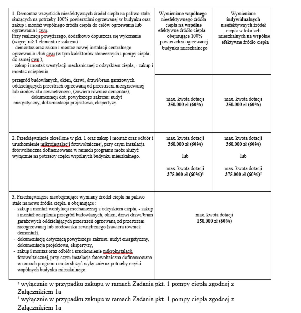 Max. kwoty dotacji opisane w powyższej tabeli nie sumują się oraz ustalone są dla istniejącego budynku mieszkalnego (do dofinansowania nie kwalifikuje się kosztów poniesionych przed oddaniem do użytkowania budynku mieszkalnego).