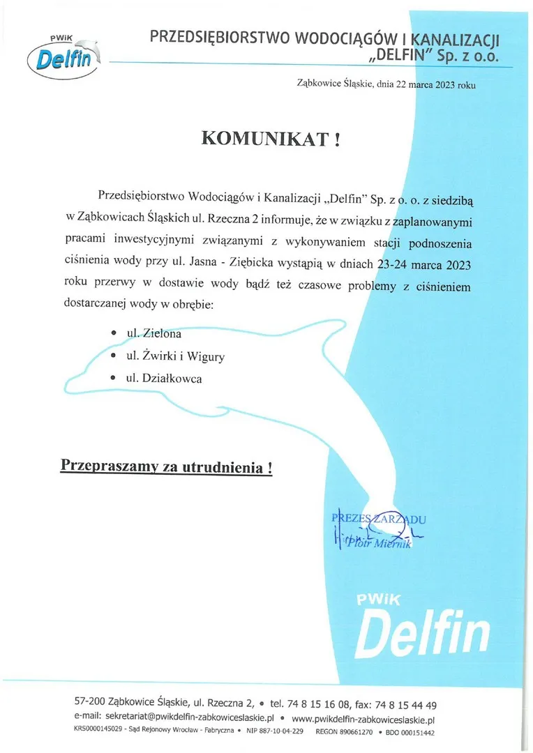 Czasowe przerwy w dostawie wody lub problemy z ciśnieniem wody w dniach 23-24.03.2023r.