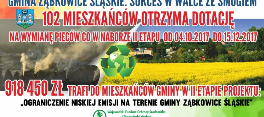 Walka o czyste powietrze w Gminie Ząbkowice Śląskie będzie jeszcze bardziej efektywna dzięki otrzymanemu wsparciu ze środków Wojewódzkiego Funduszu Ochrony Środowiska i Gospodarki Wodnej we Wrocławiu w ramach programu „Ograniczanie niskiej emisji na terenie województwa dolnośląskiego”. Blisko milion złotych trafi do mieszkańców naszej Gminy na wymianę nieekologicznych pieców centralnego ogrzewania na nowe. Z dotacji skorzystają 102 osoby, które składały zgłoszenia w drugim naborze wniosków. Wymienione zostaną w sumie 124 piece, a suma dotacji przekazanych mieszkańcom wynosi 918 450,00 złotych. Jest to kolejny już etap realizacji projektu, z którego w 2017 roku skorzystały 63 osoby. Suma wsparcia przekroczyła wtedy pół miliona złotych. Dzięki realizacji dwóch etapów projektu do mieszkańców Gminy Ząbkowice Śląskie w formie dotacji na poprawę jakości powietrza trafi ponad 1,4 miliona złotych.
