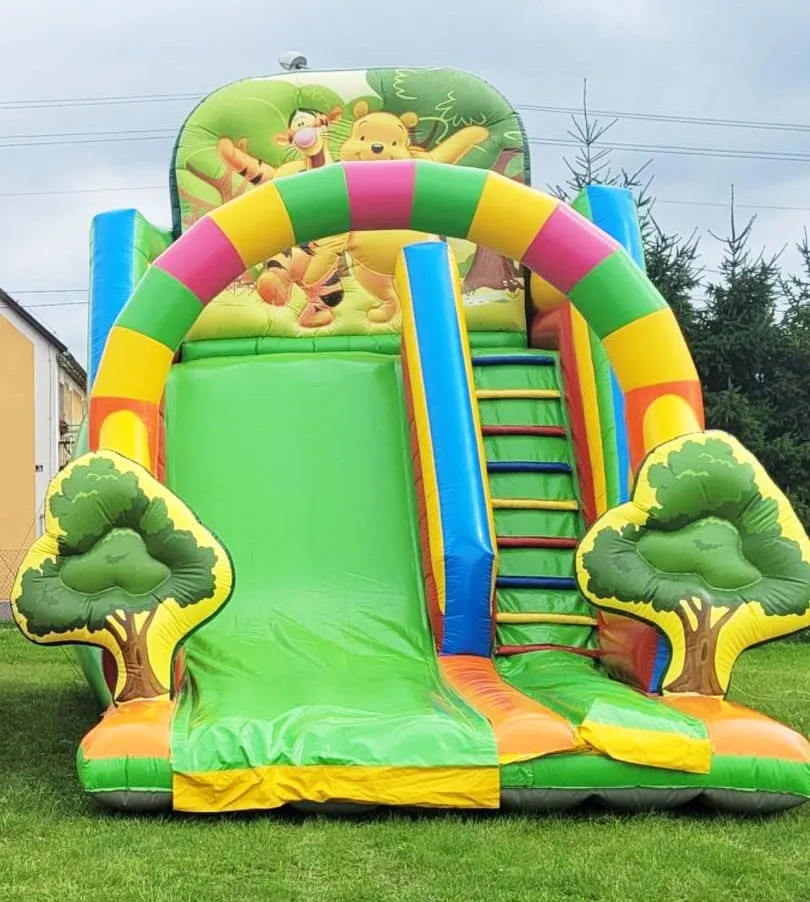 Zjeżdżalnia Kubuś Puchatek - zachęcaja wiernym przyjacielem dzieci jakim jest Kubuś puchatek z przyjaciółmi. Zamek ten ma półkę zjazdową na wysokości 4m. Do zjazdu zaprowadzi zaledwie kilka schodków. Na atrakcji może znajdować się od 6 do 8 os.