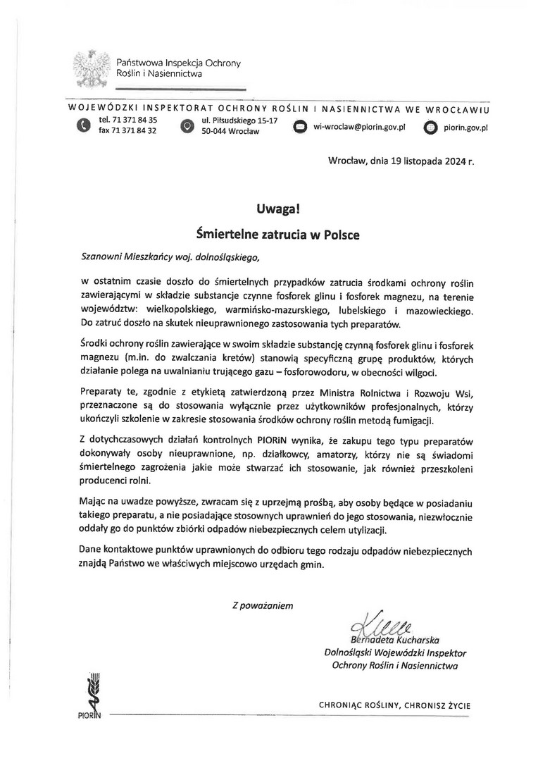 Dolnośląski Wojewódzki Inspektor Ochrony Roślin i Nasiennictwa informuje o zatruciach środkami ochrony roślin