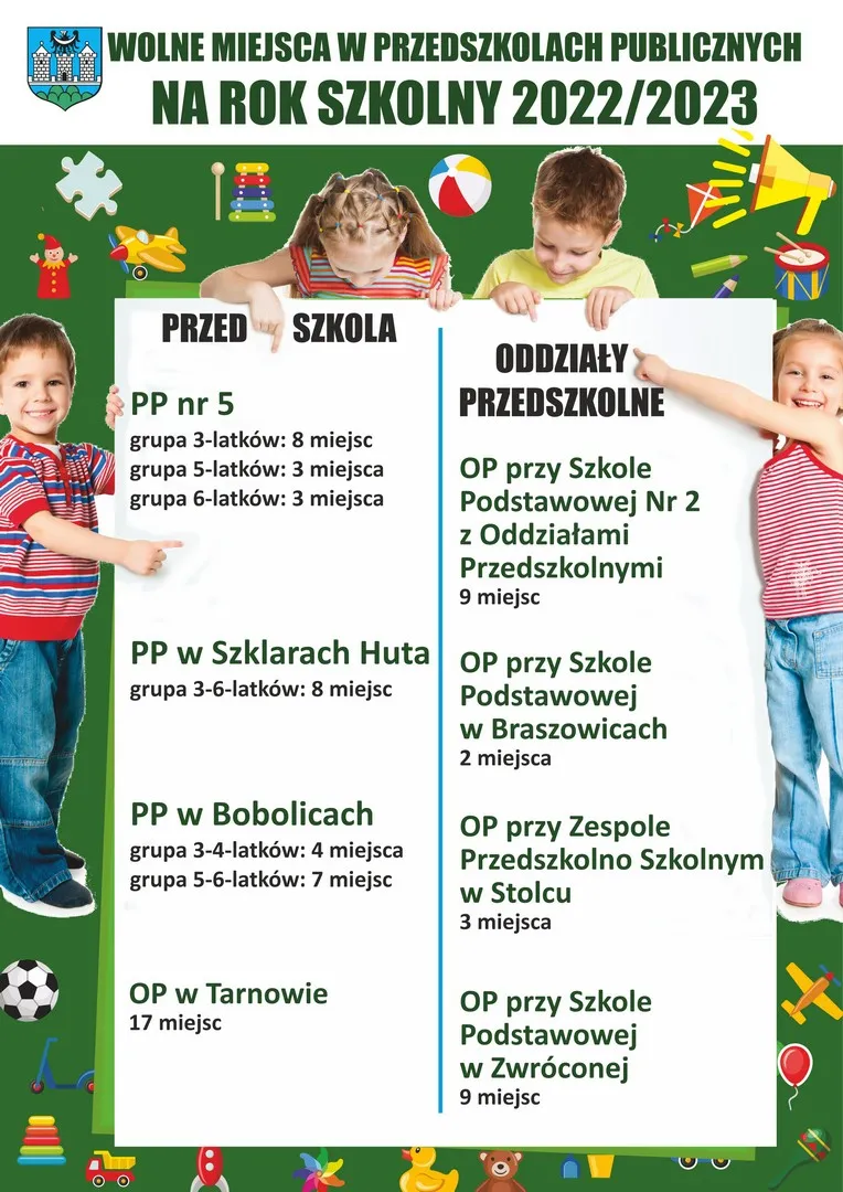Drodzy Rodzice! Są wolne miejsca w przedszkolach i oddziałach przedszkolnych na rok szkolny 2022/2023