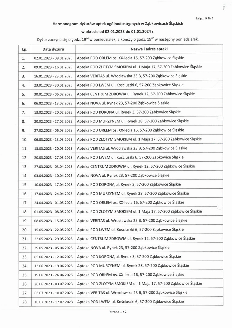 Dyżur zaczyna się w każdy poniedziałek o godz. 19:00 i kończy o godz. 19:00 w następny poniedziałek.