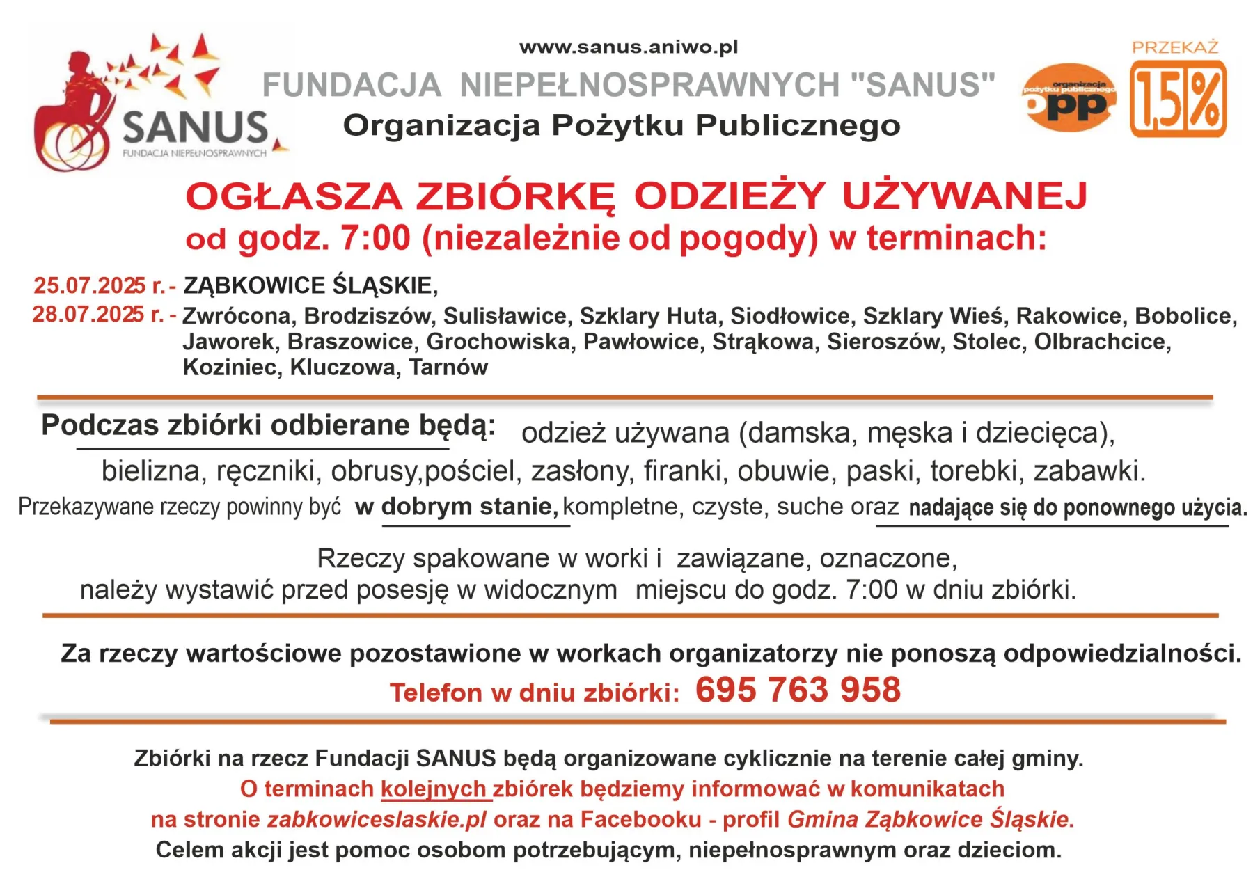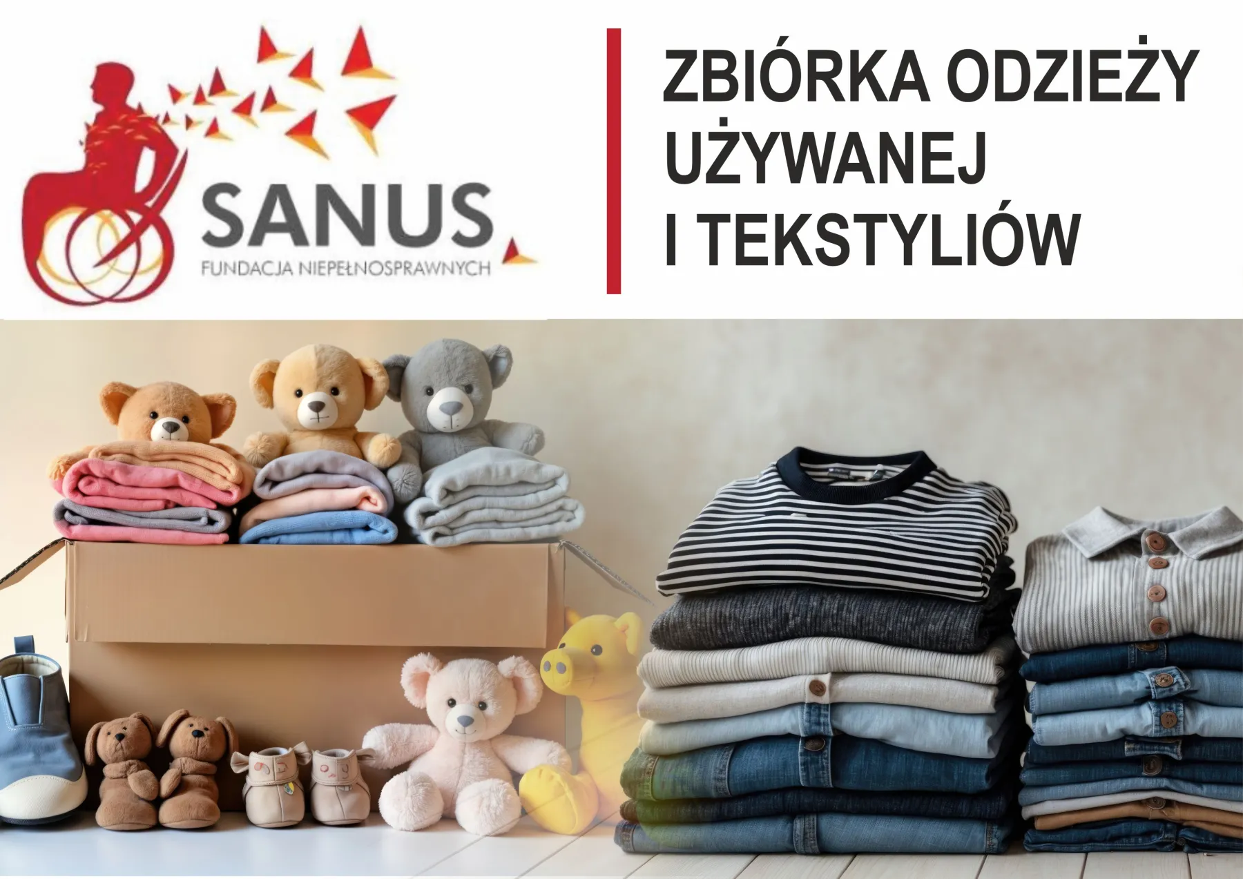Drodzy Mieszkańcy – jeżeli zalegają Wam w domach niepotrzebne rzeczy - używana odzież, bielizna, ręczniki, obrusy, pościel, zasłony, firanki, obuwie, paski, torebki, zabawki- Fundacja Niepełnosprawnych „Sanus” organizuje zbiórki.