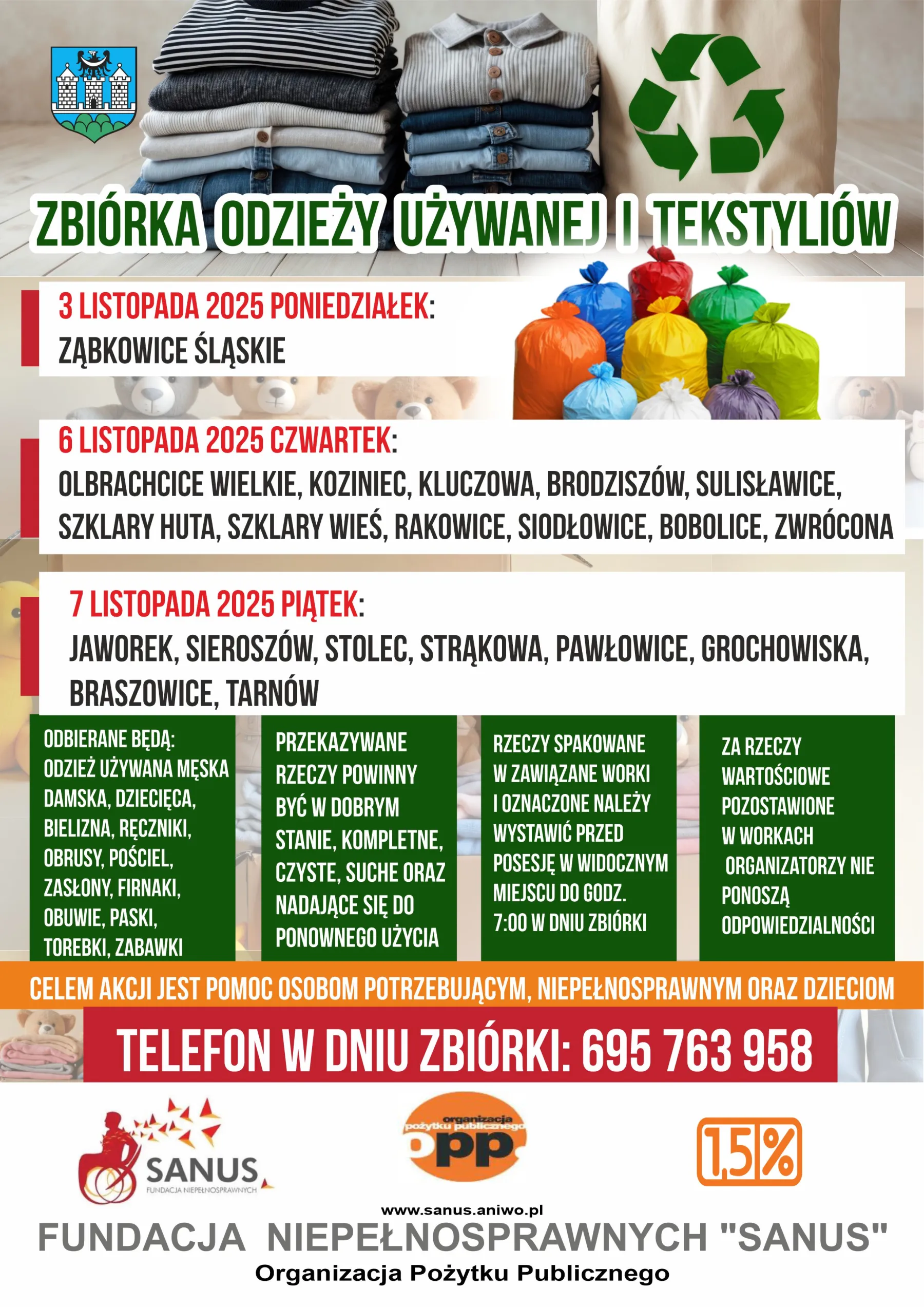 Drodzy Mieszkańcy – jeżeli zalegają Wam w domach niepotrzebne rzeczy - używana odzież, bielizna, ręczniki, obrusy, pościel, zasłony, firanki, obuwie, paski, torebki, zabawki- Fundacja Niepełnosprawnych „Sanus” organizuje drugą zbiórkę na terenie naszej gminy.