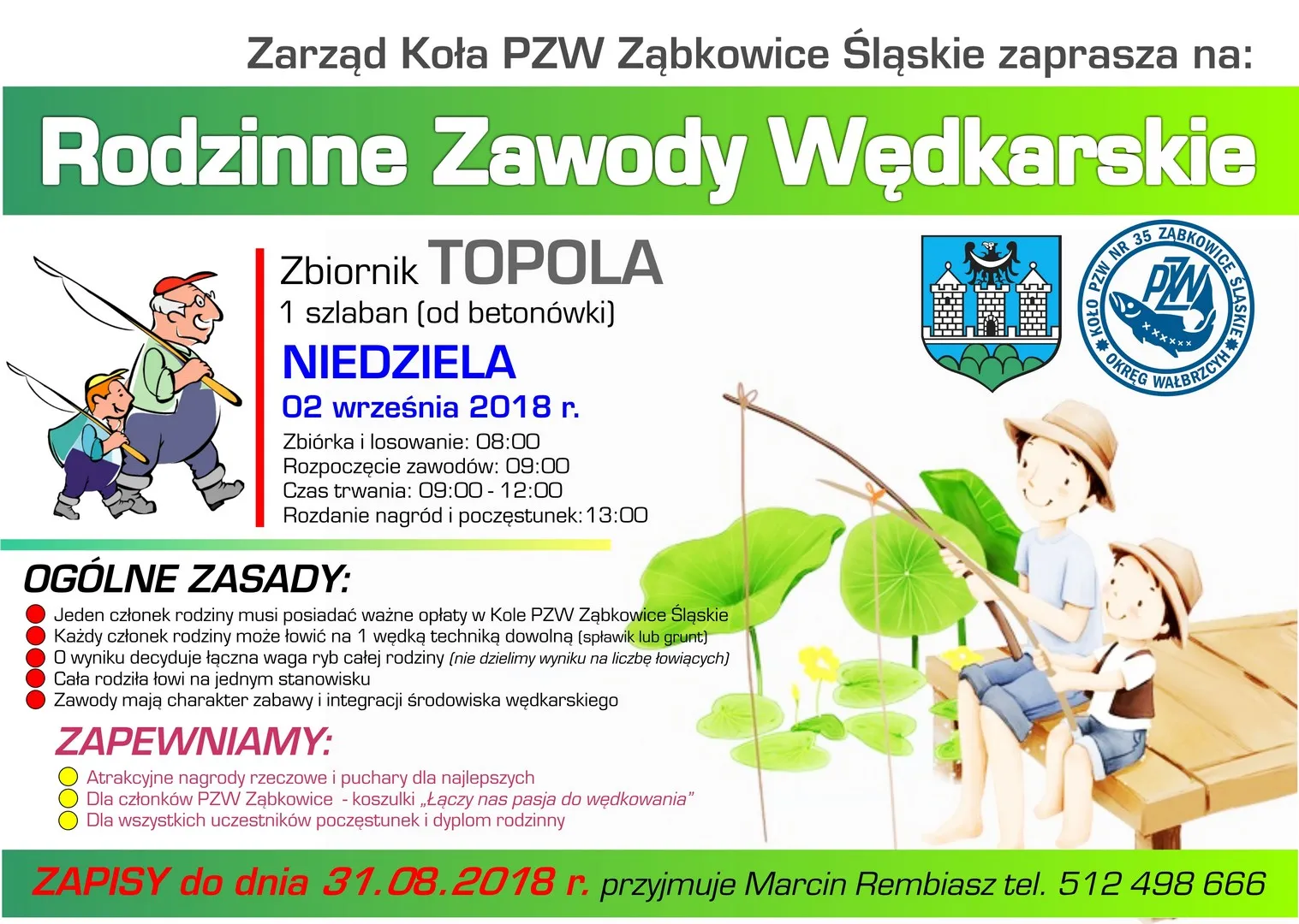 Będzie tradycyjnie słodka niespodzianka dla najmłodszych, a także nagroda specjalna dla najliczniejszej rodziny. Chcemy się integrować i budować ząbkowicką społeczność wędkarską, dlatego na zawodach nie wymagamy posiadania kart wędkarskich przez wszystkich uczestników. Tylko jedna osoba z całej rodziny musi mieć posiadać aktualne zezwolenie na połów ryb i być członkiem naszego koła – informuje Daniel Ciepierski.