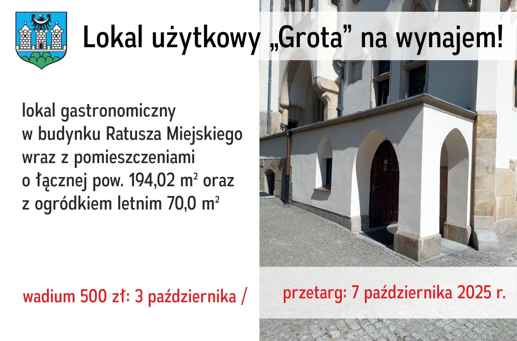 - Najem lokalu użytkowego „Grota” o pow. 161,51 m2 położonego w budynku Ratusza Miejskiego w Ząbkowicach Śląskich z przeznaczeniem na lokal do prowadzenia działalności gospodarczej – działalność gastronomiczna.