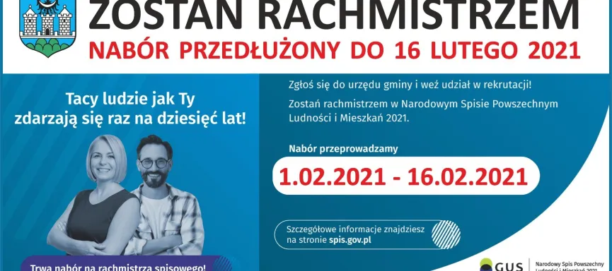 Decyzją Dyrektora Centralnego Biura Spisowego, podjętą w porozumieniu z Generalnym Komisarzem Spisowym, termin naboru kandydatów na rachmistrzów spisowych do NSP 2021 na terenie całego kraju zostaje przedłużony do 16 lutego 2021 r.