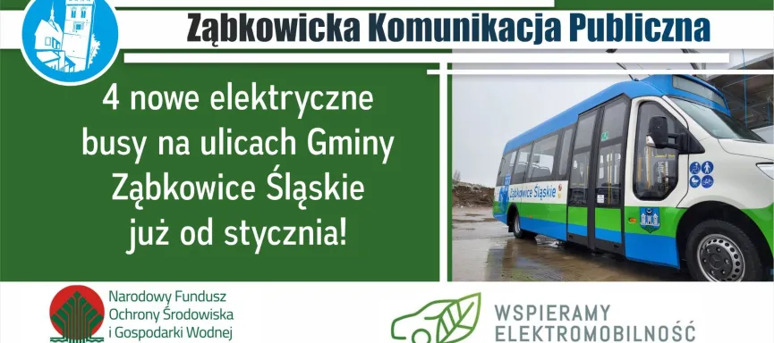 Autobusy wyruszą na trasy od 2 stycznia na dwóch liniach A i B. Zadanie realizowane jest w ramach projektu Ograniczenie niskiej emisji w Ząbkowicach Śląskich poprzez zakup zeroemisyjnego elektrycznego taboru autobusowego do obsługi Ząbkowickiej Komunikacji Publicznej w ramach programu „Zielony Transport Publiczny. Dofinansowanie przyznane jest przez Narodowy Fundusz Ochrony Środowiska i Gospodarki Wodnej.