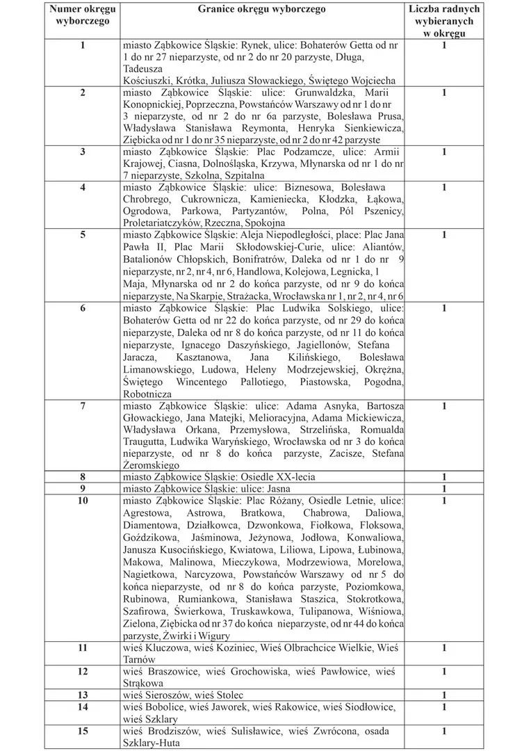 Radni będą wybierani w 15 okręgach. Z każdego okręgu mandat uzyska tylko jedna osoba z największą ilością zdobytych głosów.