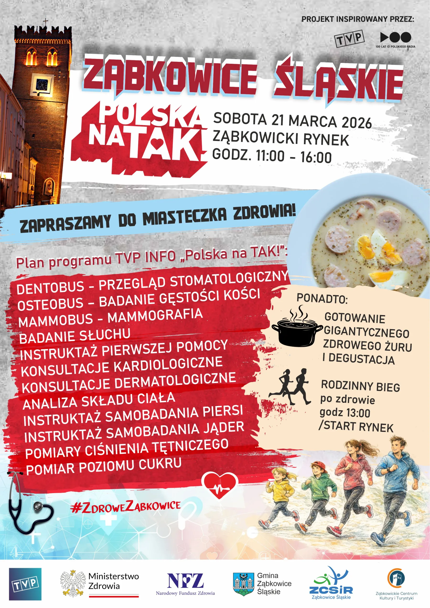 W najbliższą sobotę, 21 marca, ząbkowicki rynek zamieni się w „Miasteczko Zdrowia”. W godzinach od 11:00 do 16:00 odbędzie się tam akcja „Polska na TAK”, organizowana przez Ministerstwo Zdrowia, NFZ, Gminę Ząbkowice i Telewizję Polską. To doskonała okazja, aby skorzystać z szerokiej gamy bezpłatnych badań, konsultacji i porad. Na odwiedzających Miasteczko Zdrowia czekać będzie także wiele innych atrakcji m. in. rodzinny bieg po zdrowie oraz gotowanie zdrowego żurku połączone ze wspólną degustacją.
