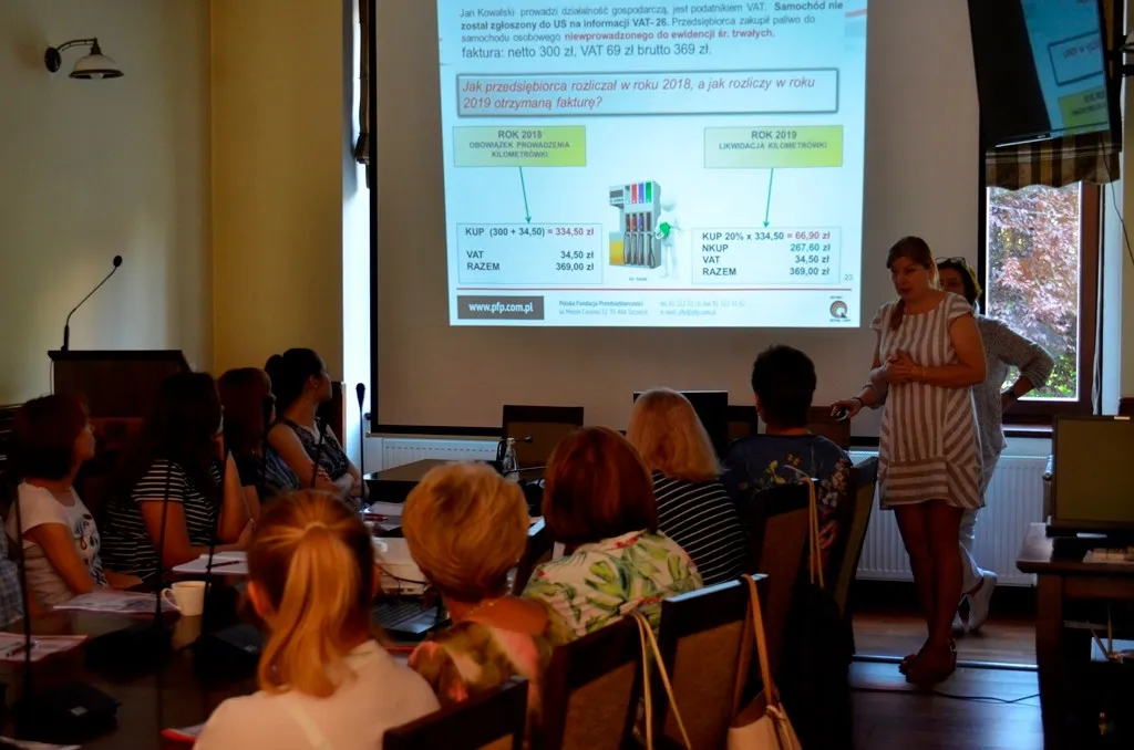 Szkolenie poprowadziła Beata Kuśmierek – praktyk, doświadczony doradca gospodarczy, trener z obszarów podatkowych, certyfikowany księgowy, przedsiębiorca - właścicielka firmy TAX DEAL certyfikowanej jednostki szkoleniowej SUS 2.0, wykładowczyni Polskiej Fundacji Przedsiębiorczości posiadająca Europejski Certyfikat Kompetencji Biznesowych. Kompleksowo i wyczerpująco omówione zostały tematy związane ze zmianami podatkowymi, które weszły od stycznia 2019 r. Zajęcia cieszyły się dużym zainteresowaniem – na sali znalazło się kilkunastu chętnych słuchaczy.