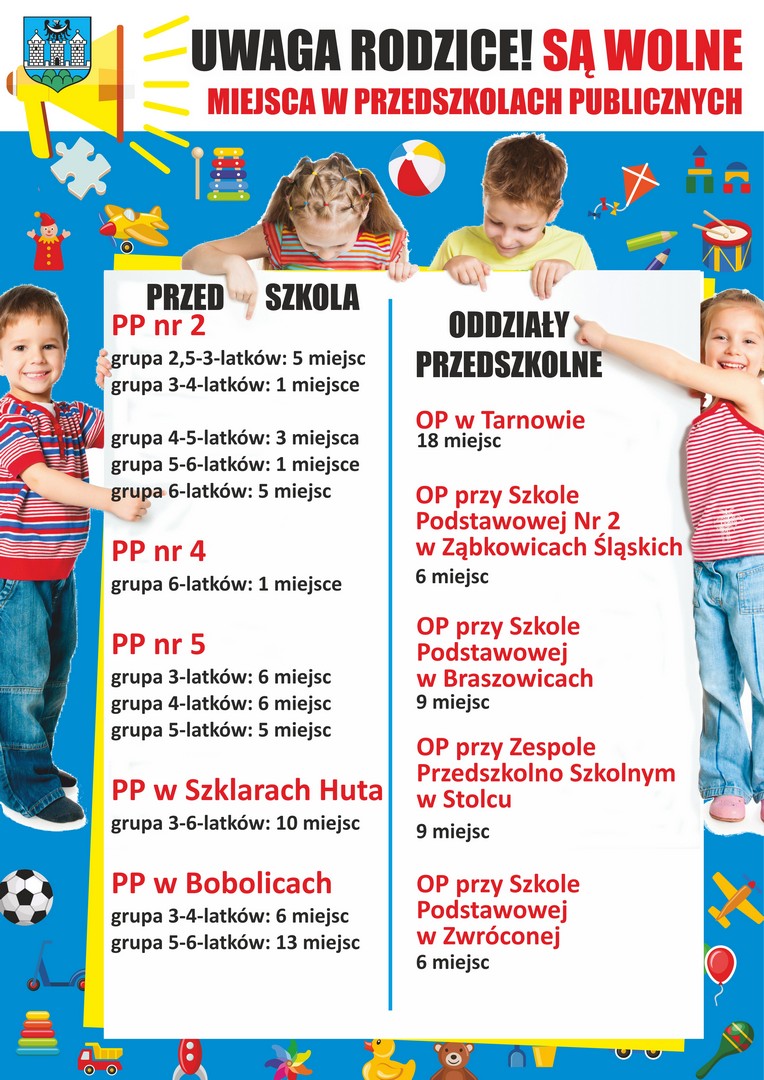 - Oddział Przedszkolny przy Szkole Podstawowej Nr 2 w Ząbkowicach Śląskich: 6 wolnych miejsc;