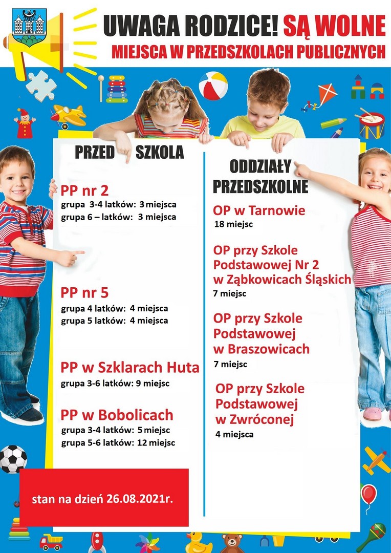 Liczba wolnych miejsc w Przedszkolach Publicznych na terenie Gminy Ząbkowice Śląskie na rok szkolny 2021/2022– stan na 26 sierpień 2021 r.