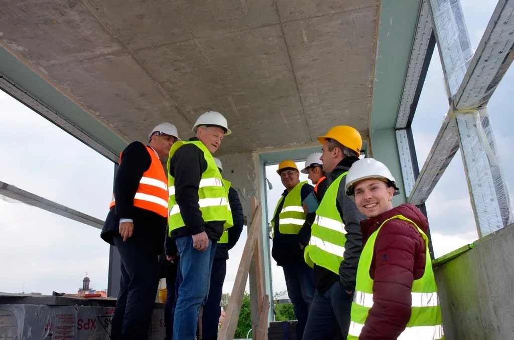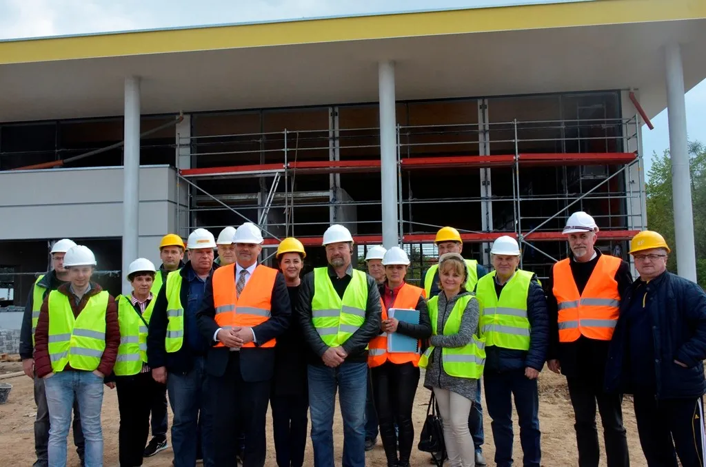 Grupa radnych Rady Miejskiej Ząbkowic Śląskich wyraziła chęć obejrzenia z bliska i sprawdzenia postępów prac przy budowie krytego basenu – największej inwestycji w najnowszej historii gminy. Burmistrz Marcin Orzeszek wraz z radnymi odwiedził we wtorek 7 maja teren budowy. Radni dokładnie obejrzeli postępy prac i ocenili je pozytywnie. Budowa postępuje bowiem zgodnie z planem, w najbliższym czasie montowane będą już elementy fasady szklanej.