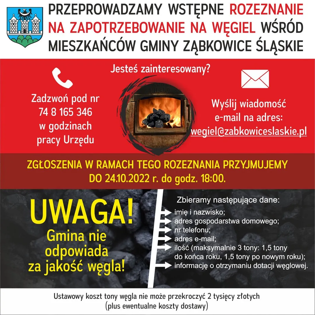 UWAGA! GMINA ZĄBKOWICE ŚLĄSKIE NIE ODPOWIADA ZA JAKOŚĆ WĘGLA!